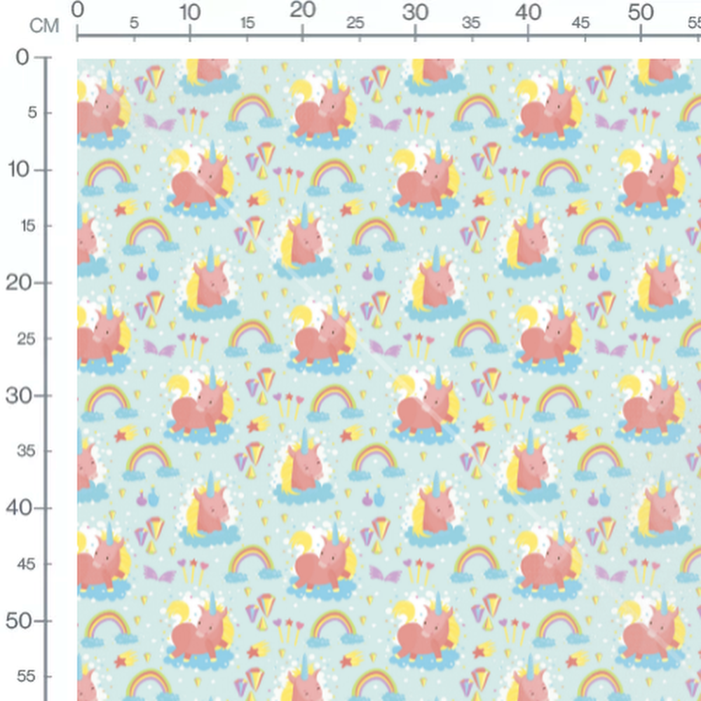 Des nuages bleus et des ailes violettes complètent le motif. Des cristaux multicolores et des étoiles jaunes ajoutent une touche magique. Des arcs-en-ciel avec des nuages bleus sont dispersés sur le fond. Des petites étoiles blanches parsèment l'ensemble du motif.Les tissus
