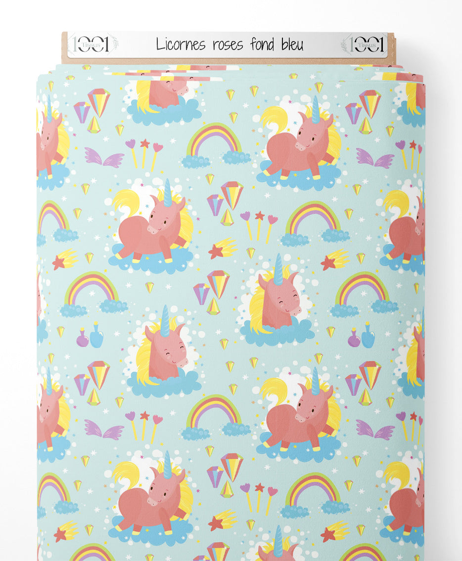 Tissu - Licornes roses sur fond bleu