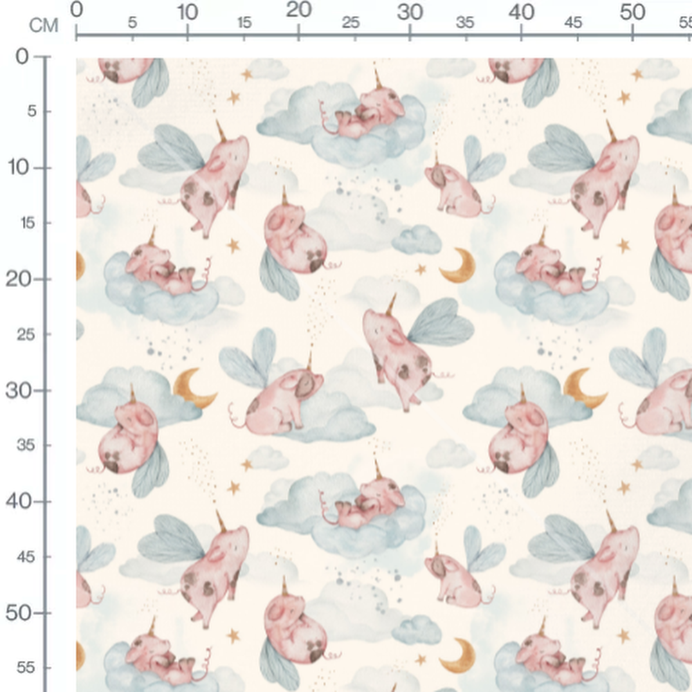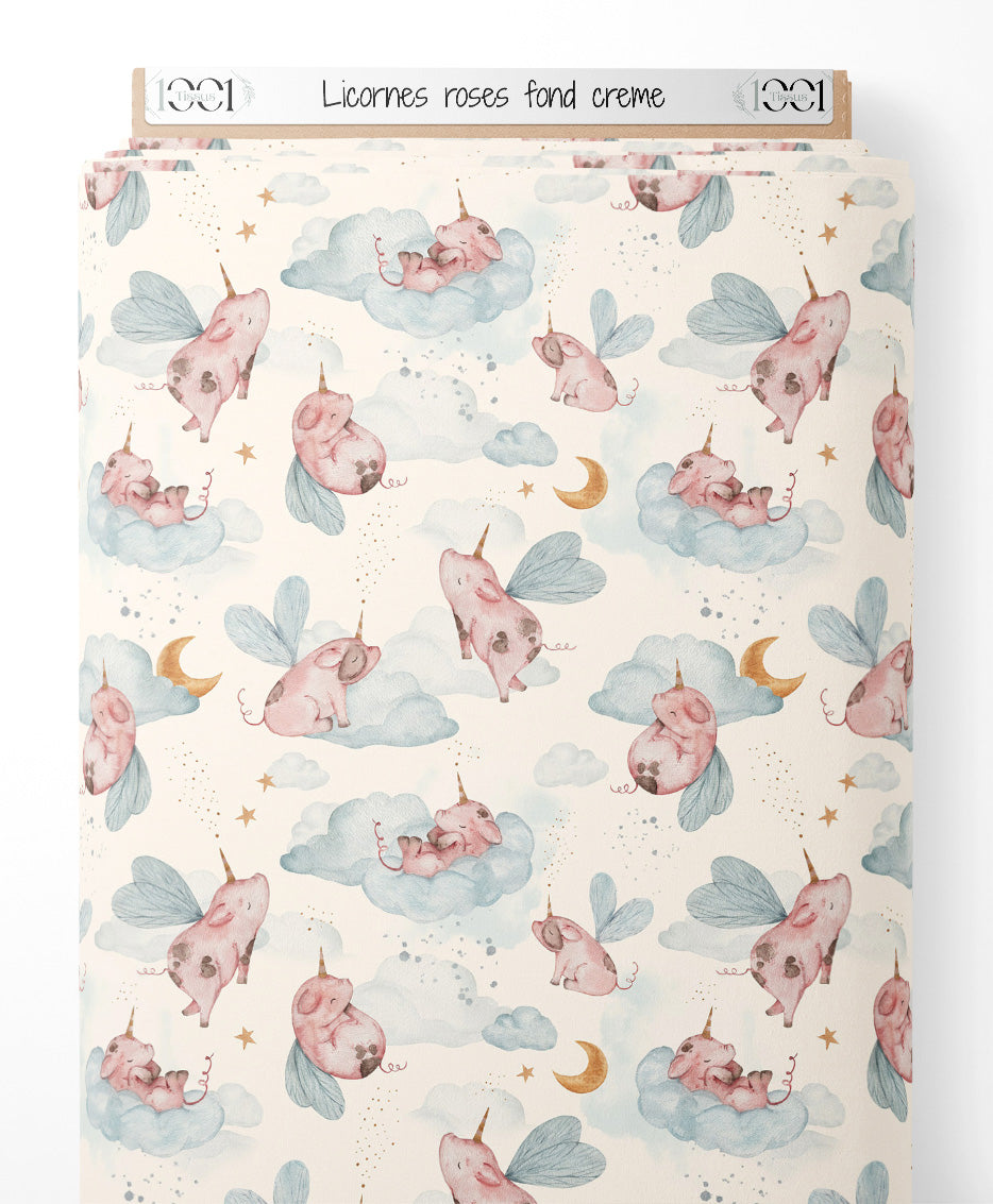 Les licornes roses ont des ailes bleues et des cornes dorées. Elles sont posées sur des nuages bleus et blancs. Des étoiles dorées et des lunes complètent le motif. Le fond est d'une teinte crème douce.Les tissus