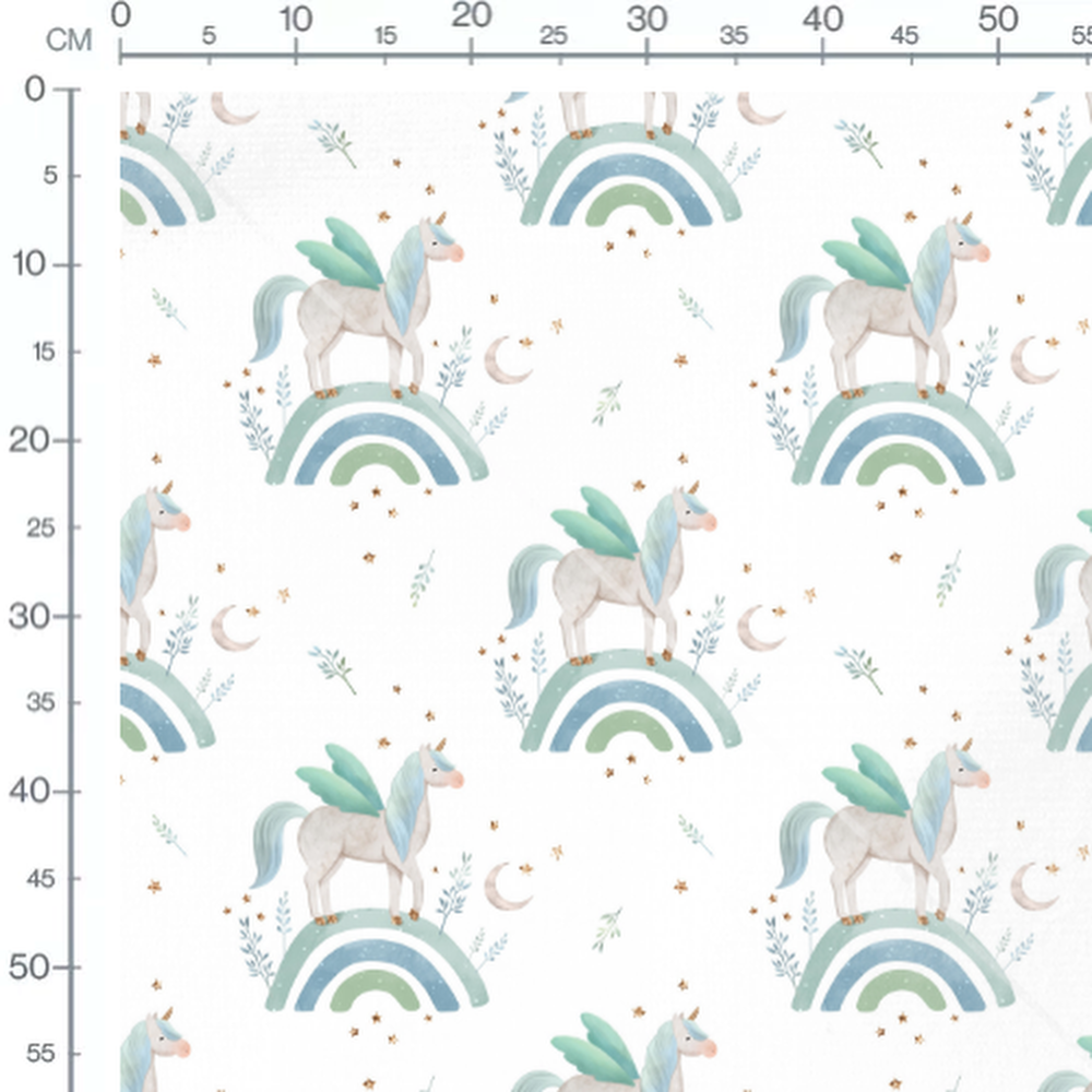 Les licornes ont des ailes vertes et des crinières bleues. De petites étoiles dorées parsèment le motif. Des croissants de lune et des branches feuillues complètent le design.Les tissus