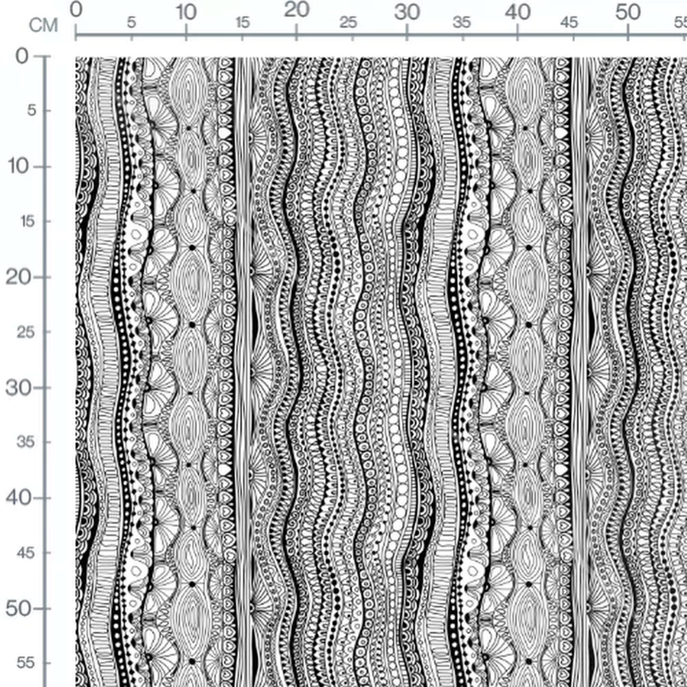 Les motifs incluent des formes géométriques variées et répétitives. Les lignes ondulées créent un effet de mouvement sur le fond. Les motifs sont principalement composés de cercles, de lignes et de formes ovales.Les tissus