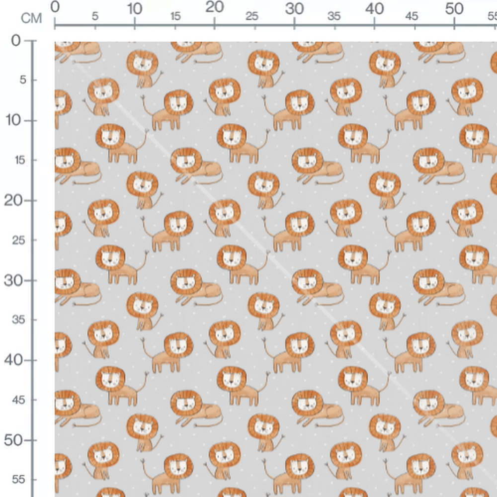 Les lions ont des expressions simplifiées et des traits noirs. Le fond est parsemé de petits carrés blancs.Les tissus