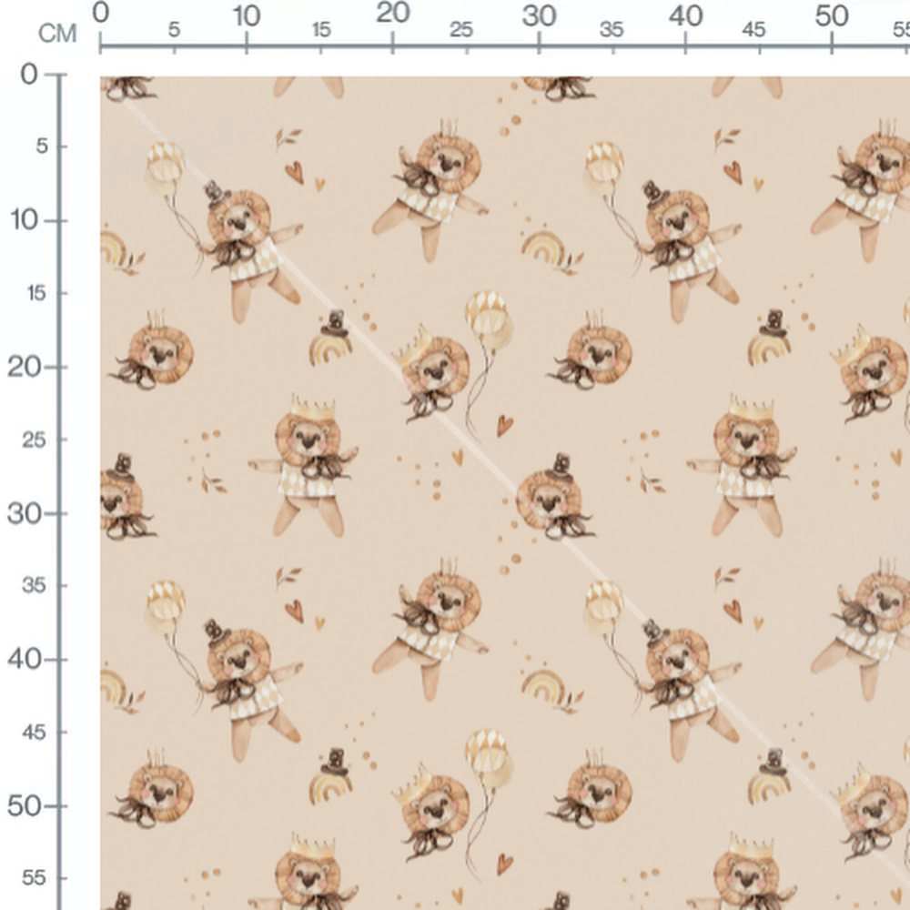 Les lions portent des vêtements à motifs géométriques. Les ballons sont décorés de motifs en losange. Des arcs-en-ciel et des feuilles complètent le motif.Les tissus