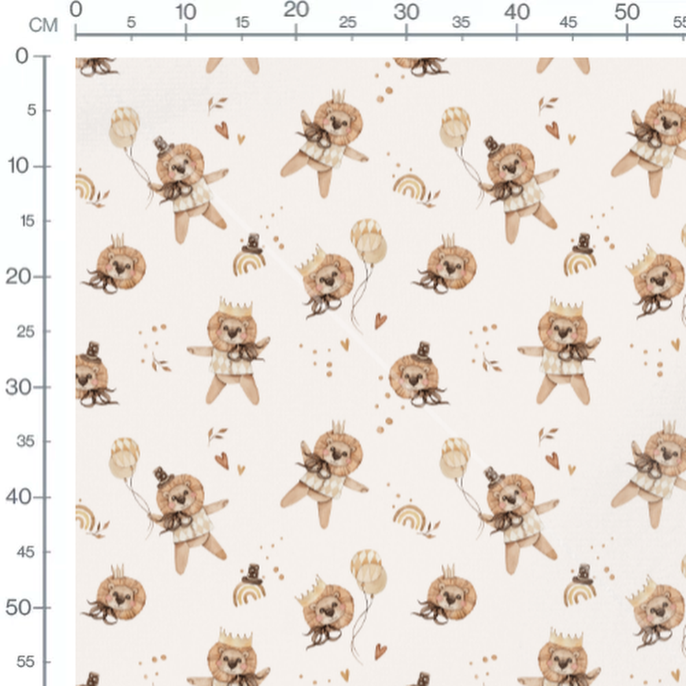 Les lions portent des costumes avec des nœuds papillon et des couronnes. Des ballons à motifs géométriques flottent autour. Des petits chapeaux et des feuilles complètent le motif.Les tissus