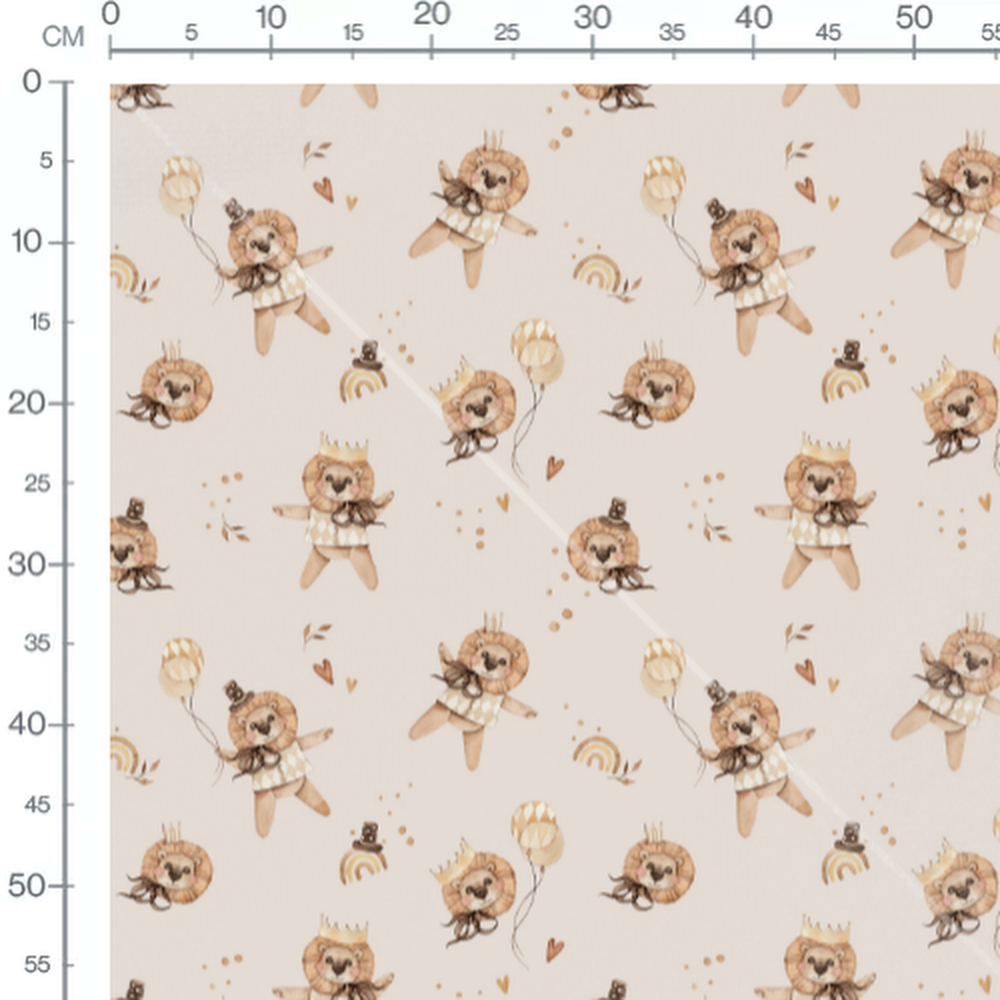 Les lions portent des costumes avec des nœuds papillon et des couronnes. Des ballons à motifs géométriques flottent à côté des lions. De petits chapeaux haut-de-forme et des cœurs complètent le motif.Les tissus