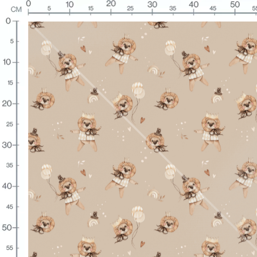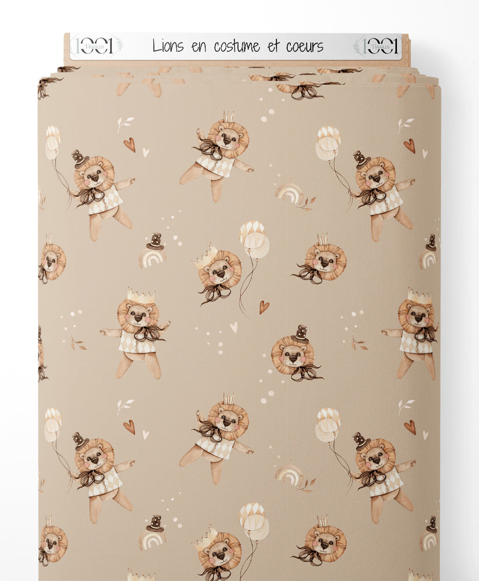 Les lions portent des costumes avec des motifs géométriques. Des ballons et des arcs-en-ciel complètent le motif. Des petits cœurs et des chapeaux sont dispersés autour des lions.Les tissus