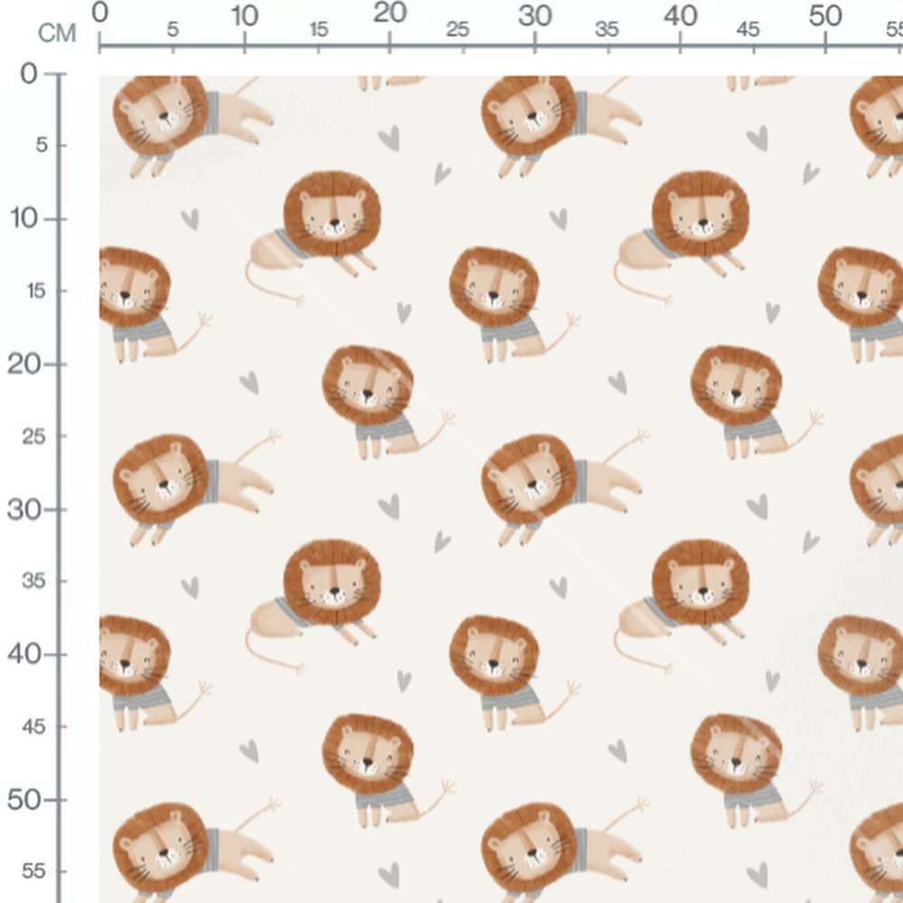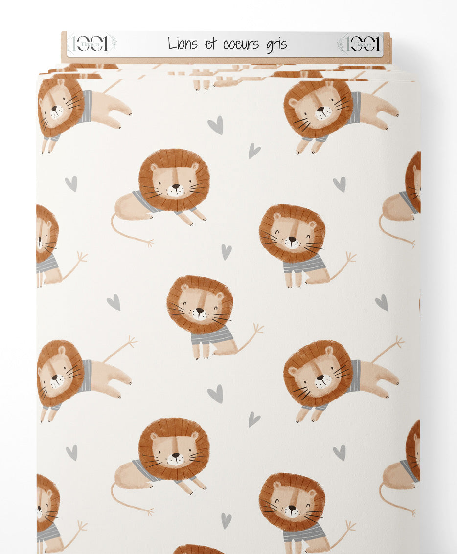 Les lions portent des petits vêtements rayés. Les cœurs ajoutent une touche douce et ludique.Les tissus