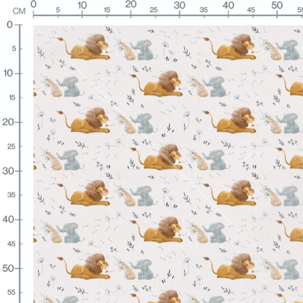 Les lions sont couchés avec une crinière détaillée. Les éléphants sont assis à côté des lions. Des fleurs et des herbes ajoutent une touche de nature au motif.Les tissus