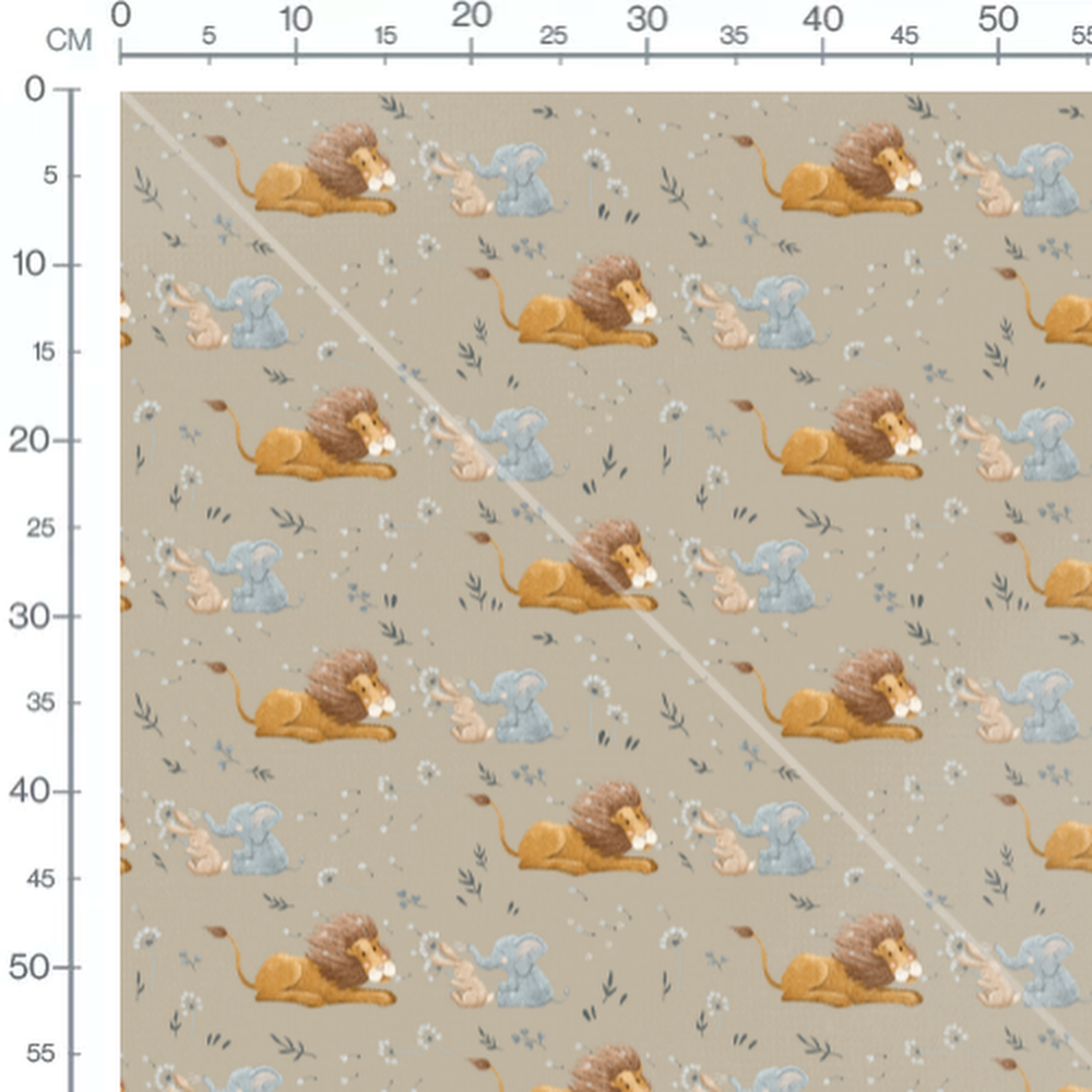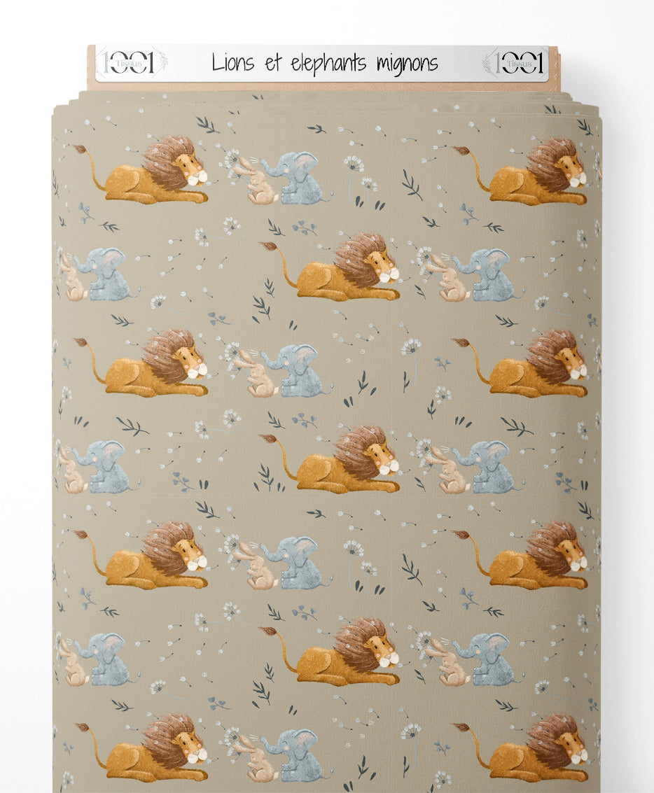 Les lions sont allongés avec une crinière détaillée. Les éléphants sont assis à côté de petits lapins. Des fleurs blanches et des feuillages gris ajoutent une touche délicate au motif.Les tissus
