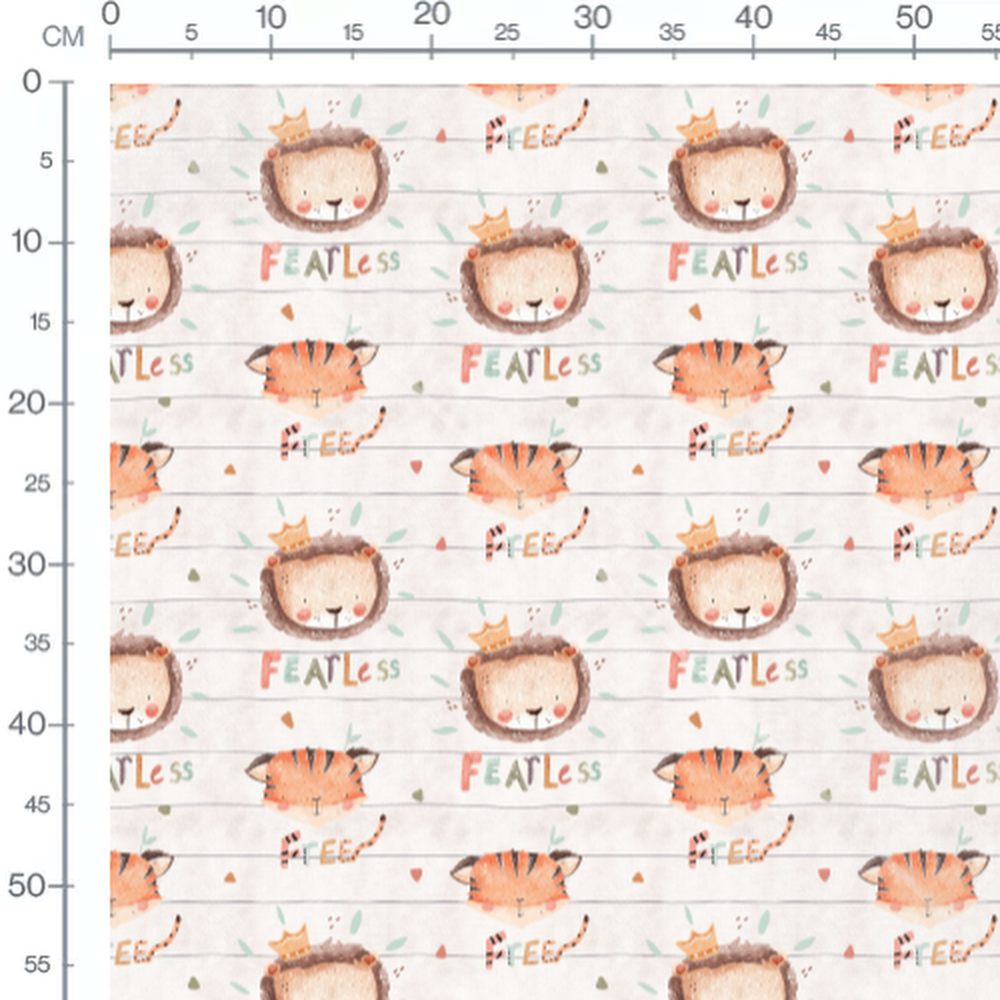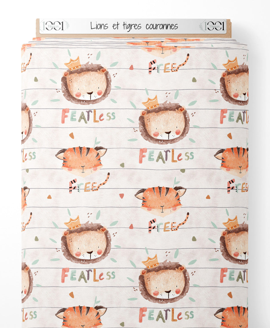 Les lions portent des couronnes dorées. Les tigres sont orange avec des rayures noires. Les mots 'Fearless' et 'Free' sont écrits en lettres multicolores.Les tissus