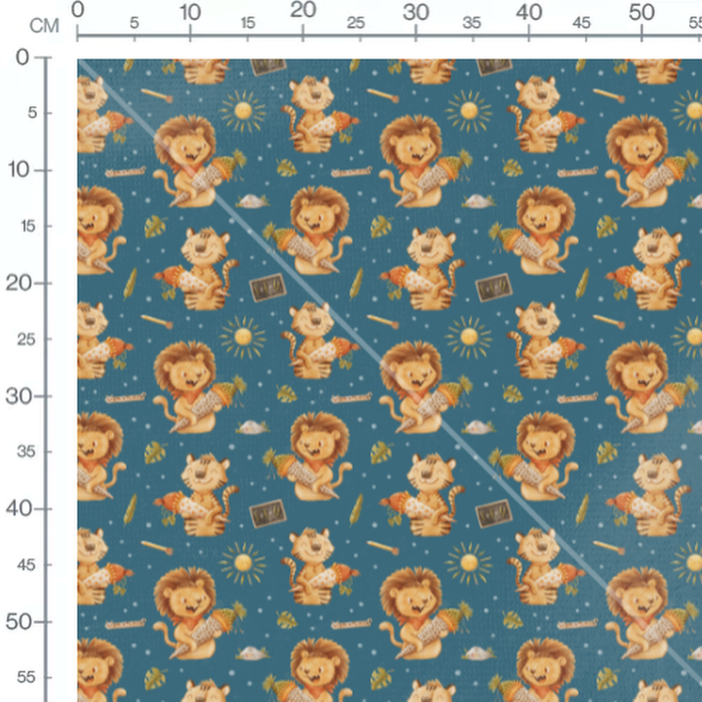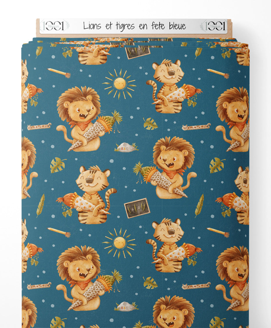 Les lions tiennent des crayons géants et portent des foulards rouges. Des tigres souriants sont également présents avec des crayons. Le fond bleu est parsemé de petits points blancs et de motifs de feuilles tropicales. Un soleil jaune avec des rayons est visible, ajoutant une touche lumineuse.Les tissus