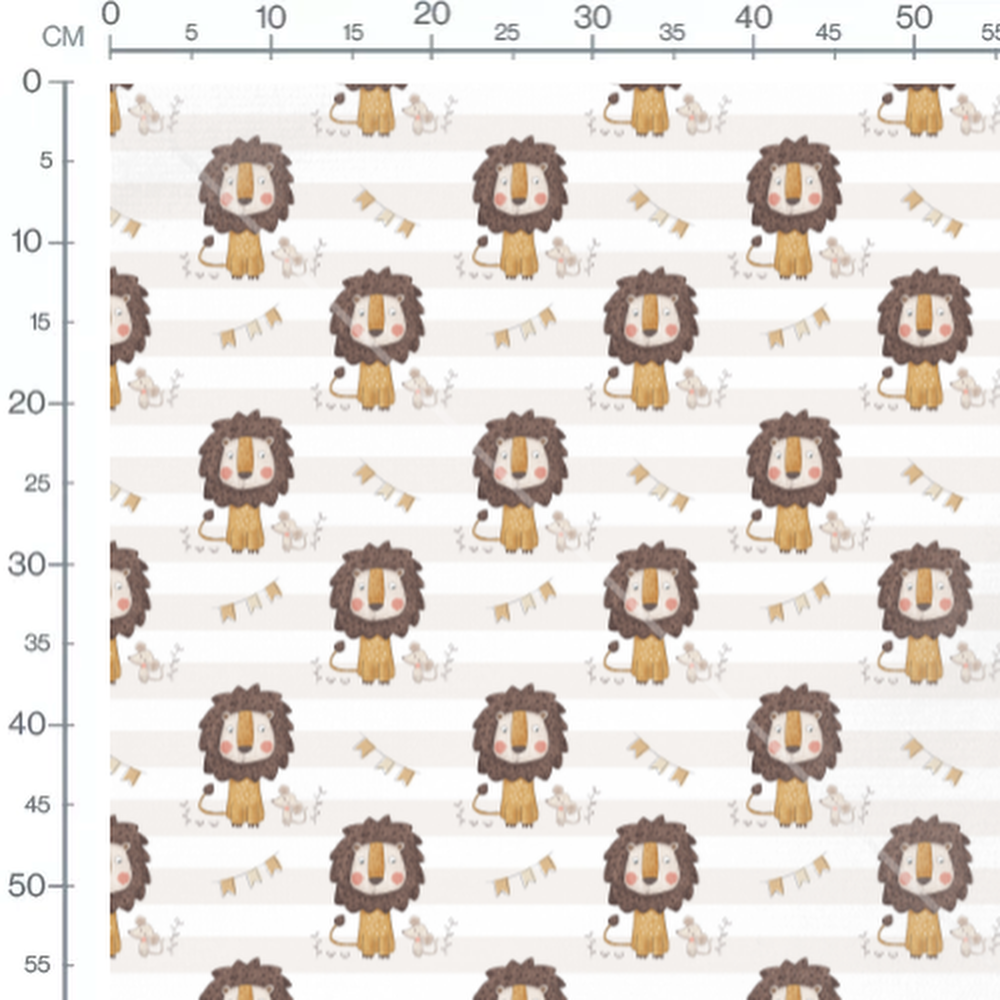 Les lions ont une crinière marron foncé et un corps jaune. Les souris sont petites avec des joues roses. Des guirlandes beige et blanche décorent le motif. De petites plantes stylisées complètent le design.Les tissus