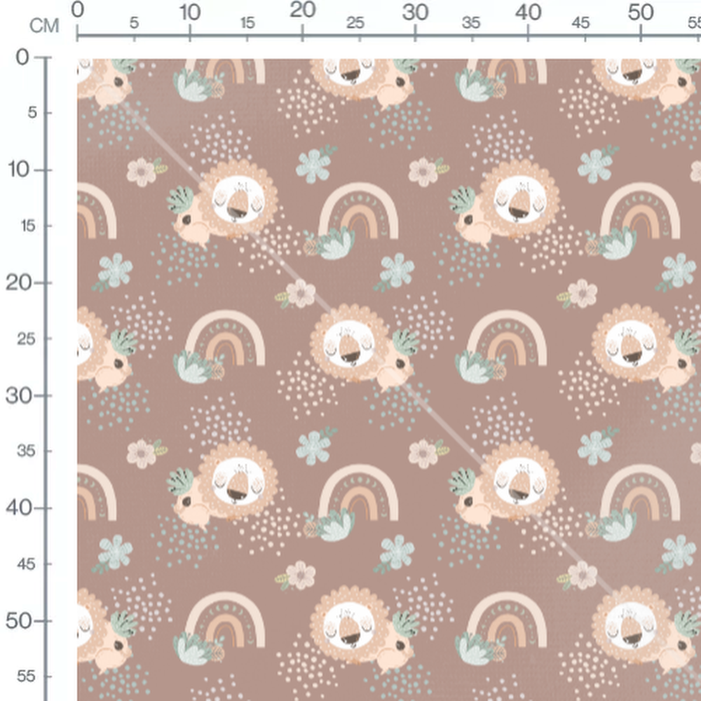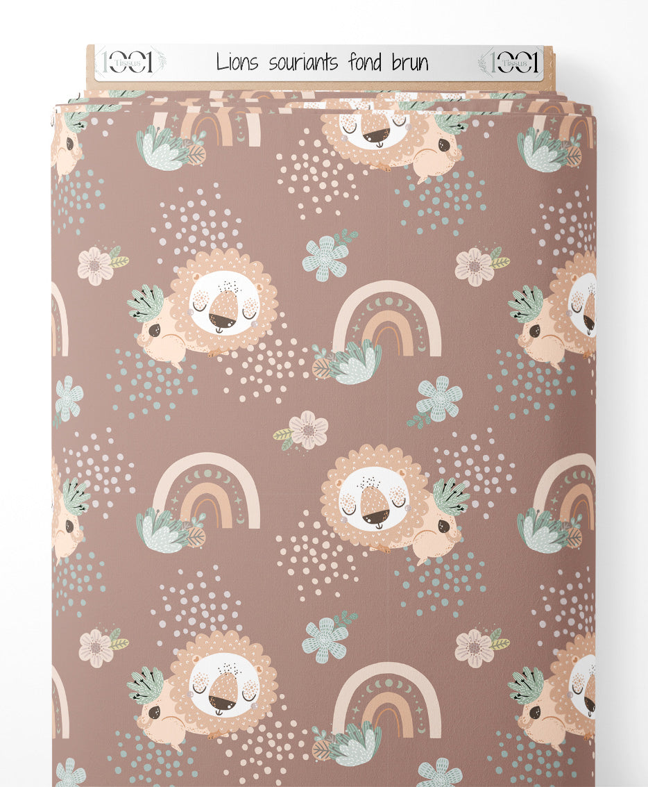 Les lions sont entourés de petites fleurs bleues et roses. Des arcs-en-ciel aux teintes douces ajoutent une touche ludique. Des points blancs et bleus complètent le motif. Les éléments sont disposés sur un fond brun apaisant.Les tissus
