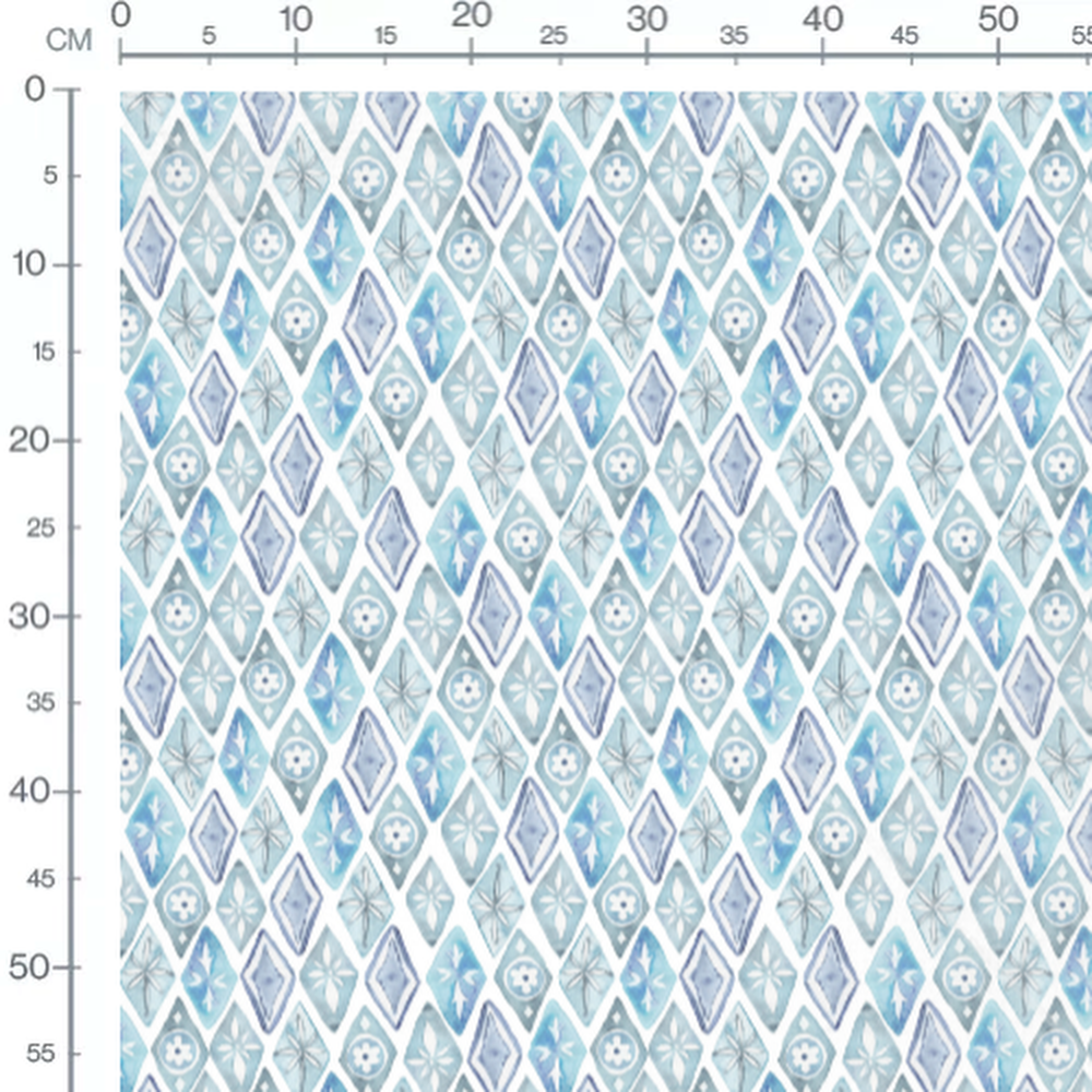 Les losanges présentent des motifs floraux et géométriques variés. Les couleurs varient entre différentes nuances de bleu et de gris. Chaque losange est unique avec des détails aquarelle. Le fond blanc met en valeur les motifs délicats.Les tissus