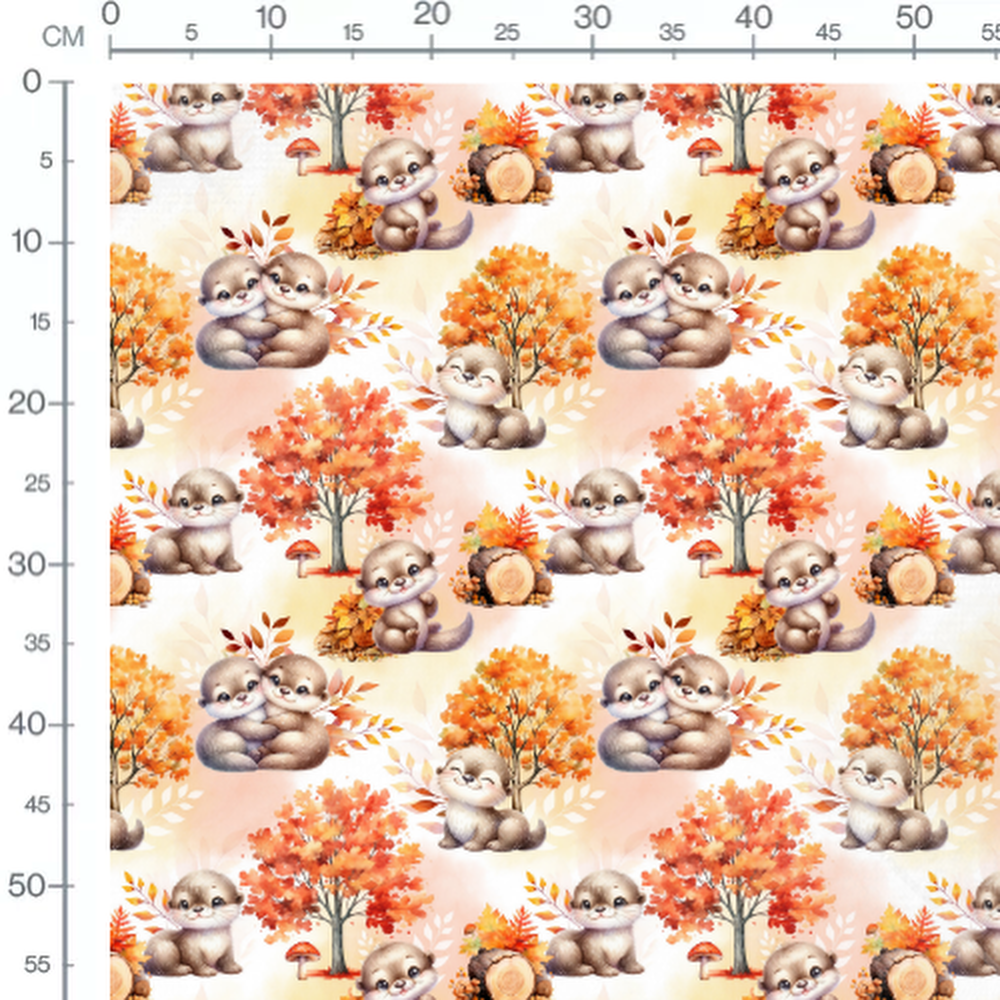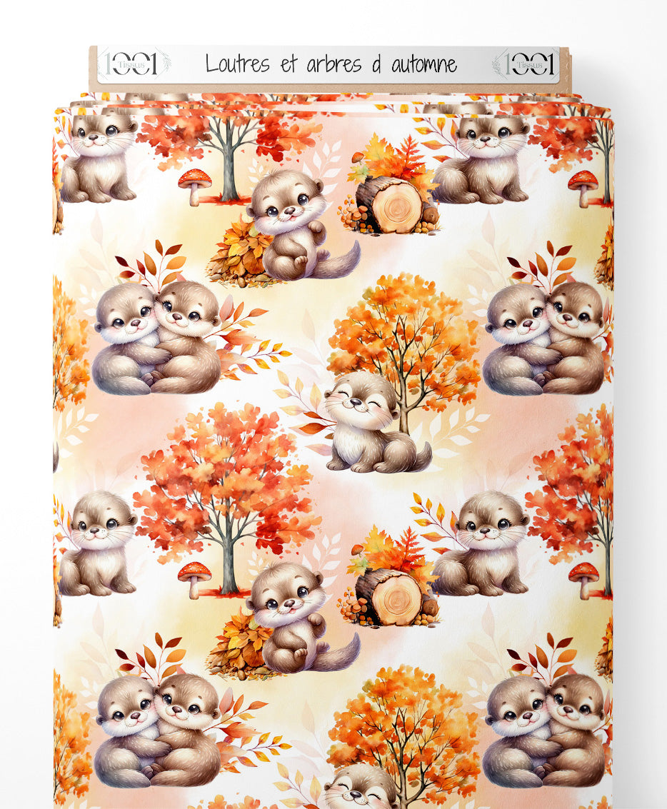 Les loutres sont entourées de troncs d'arbres et de feuillages aux teintes automnales. Des champignons rouges ajoutent une touche de couleur vive. Le fond clair met en valeur les nuances chaudes des feuilles et des animaux.Les tissus