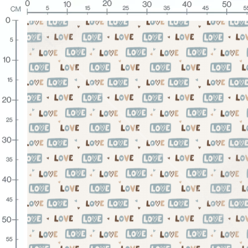 Les lettres LOVE sont accompagnées de petits cœurs. Les couleurs principales sont le marron et le bleu sur un fond crème.Les tissus