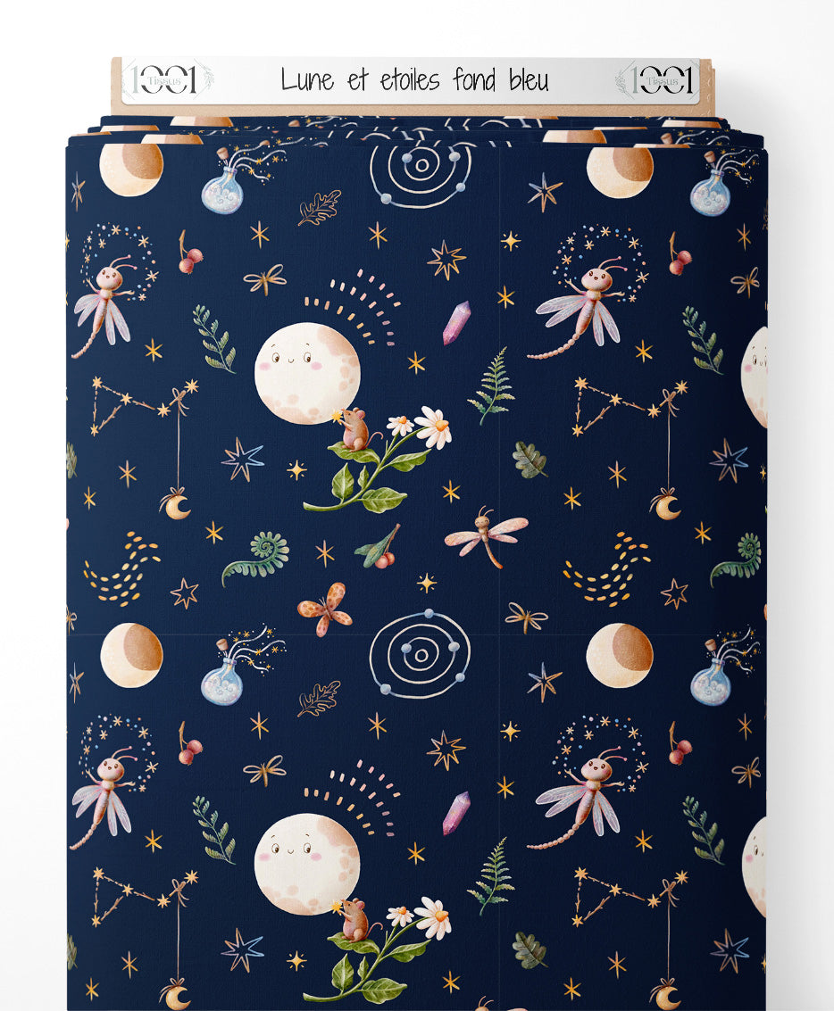 Tissu - Lune et étoiles sur fond bleu