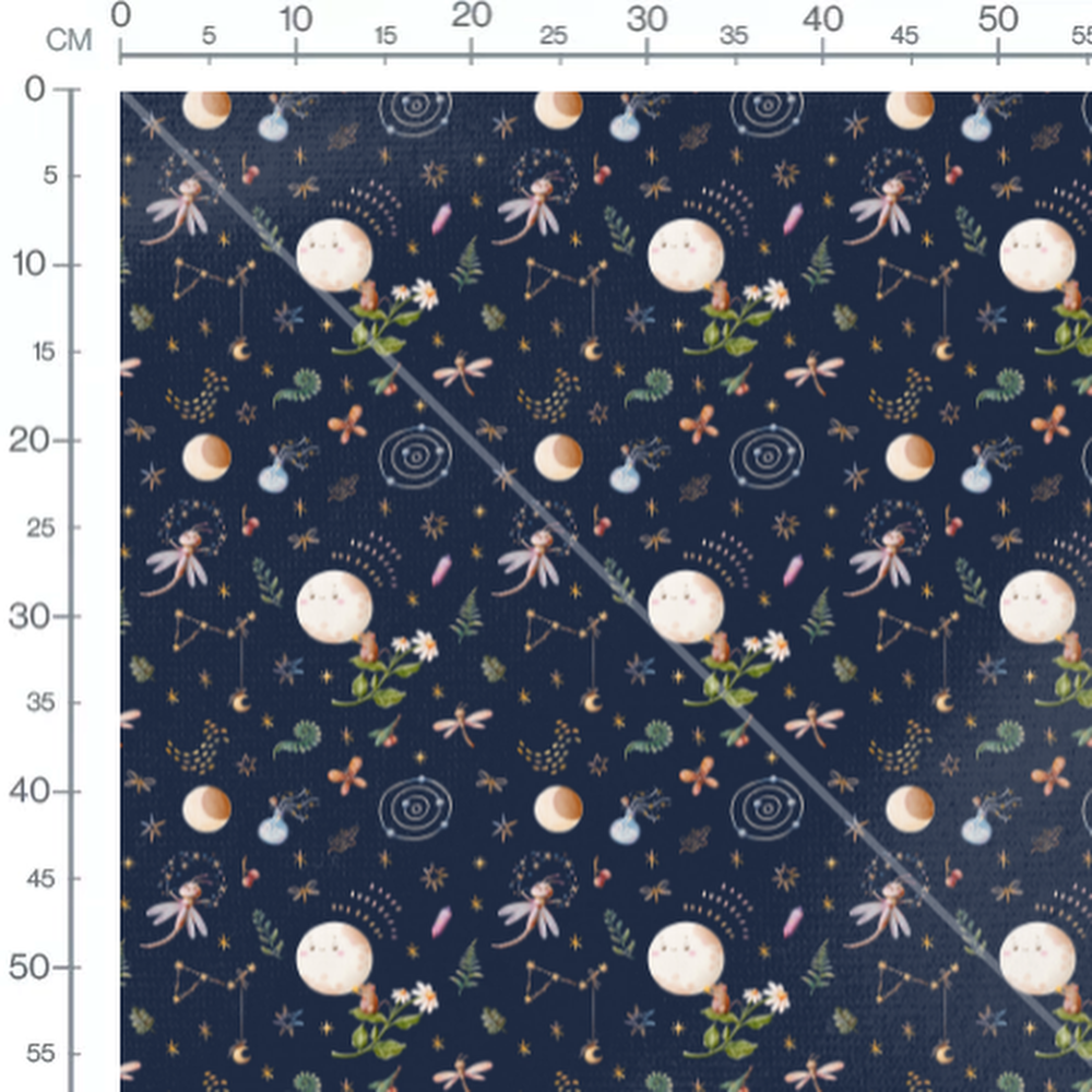 Constellations et planètes ajoutent une touche céleste. Petits animaux et fleurs complètent le motif. Éléments magiques comme des fioles et cristaux dispersés.Les tissus