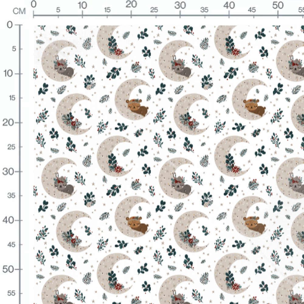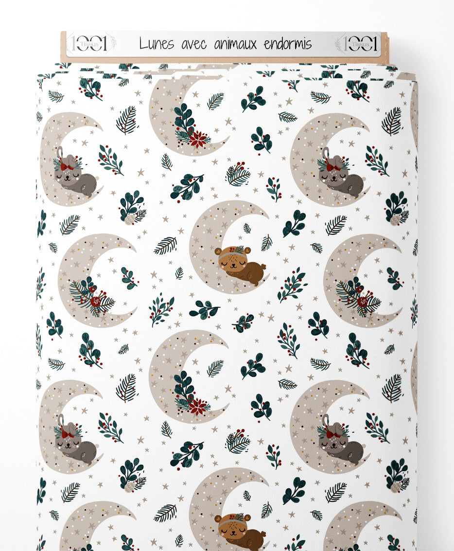 Les lunes sont décorées de petites étoiles grises. Les feuillages verts sont accompagnés de baies rouges et noires. Les animaux sont paisiblement endormis, ajoutant une touche de douceur au motif.Les tissus