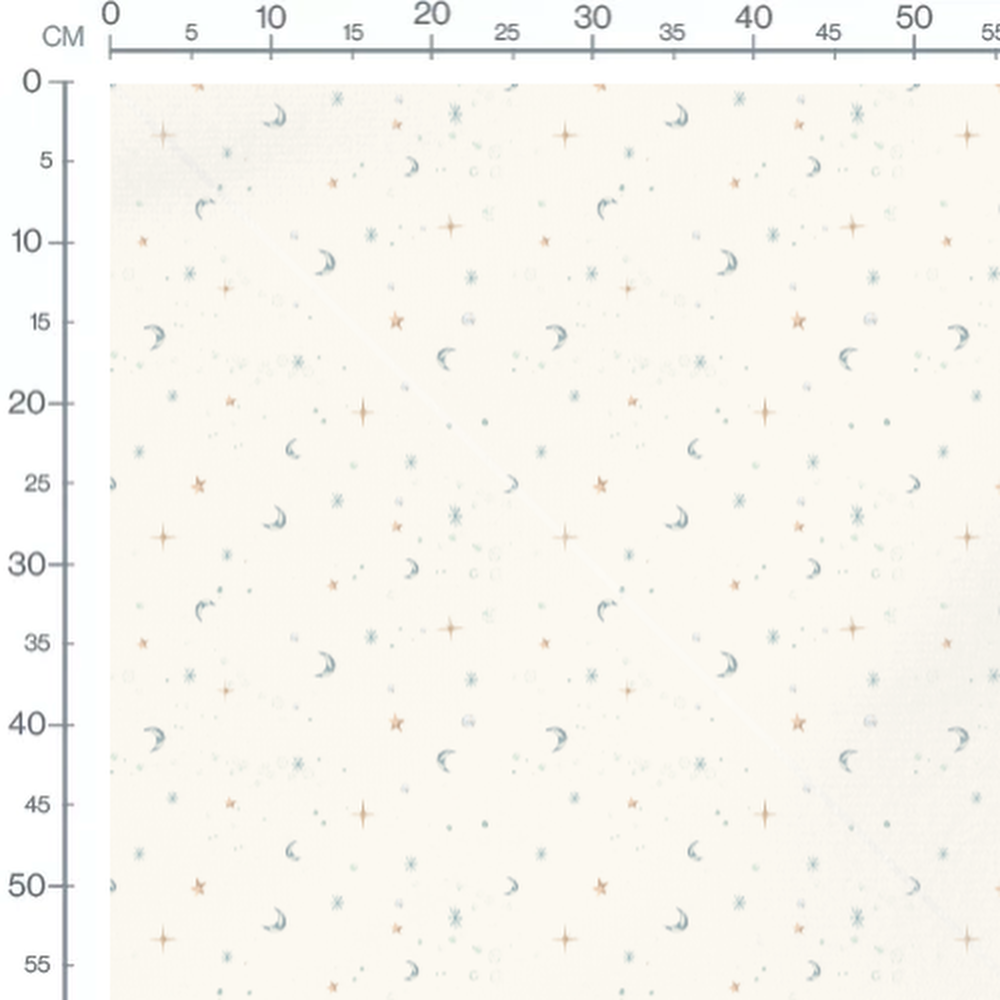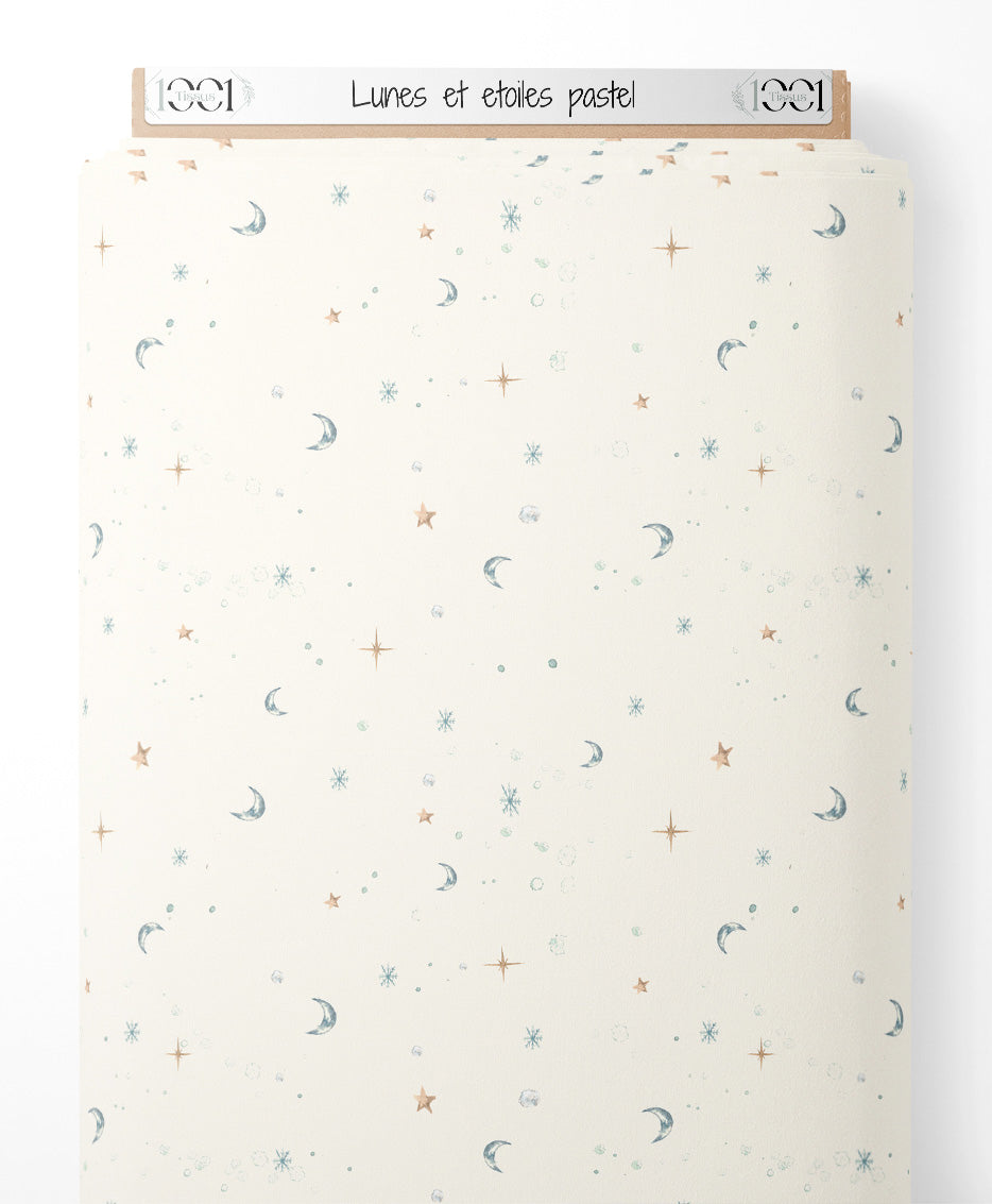 Des croissants de lune gris sont accompagnés de petites étoiles dorées. De délicats flocons bleus et des points épars ajoutent une touche de douceur. Le fond crème met en valeur ces éléments célestes.Les tissus