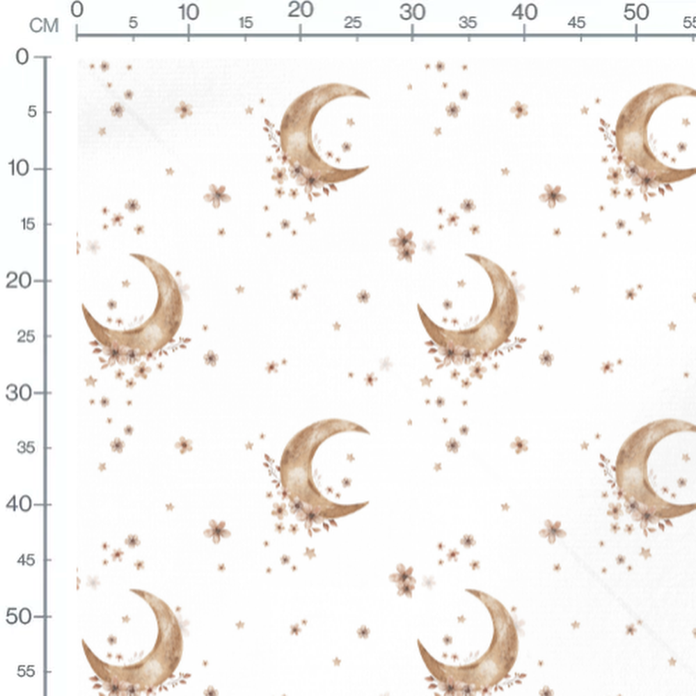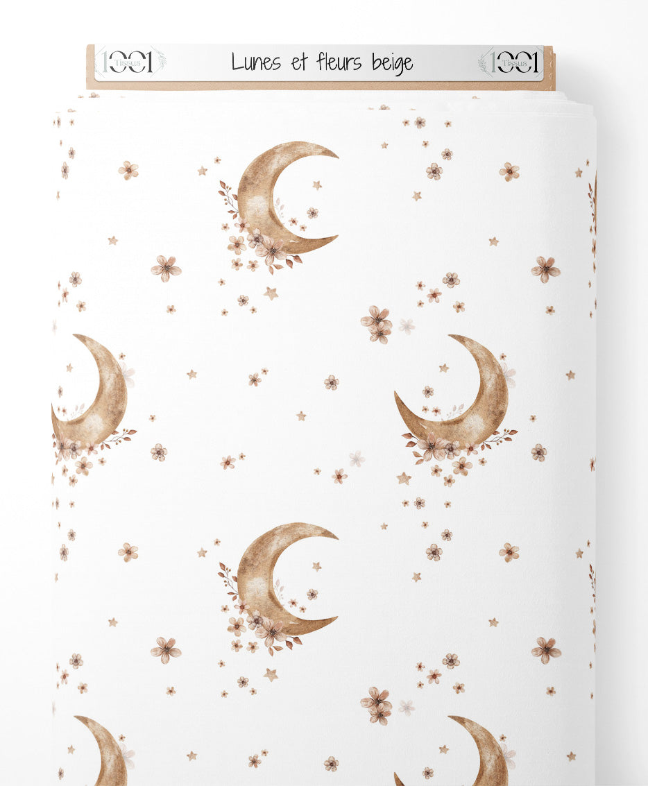 Les lunes sont entourées de petites fleurs beige et de feuilles. Des étoiles beige sont éparpillées sur le fond blanc. Les fleurs ajoutent une touche délicate au motif lunaire.Les tissus