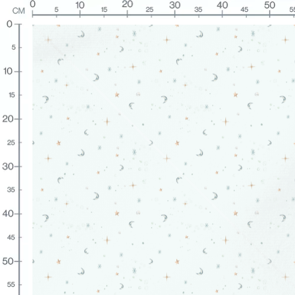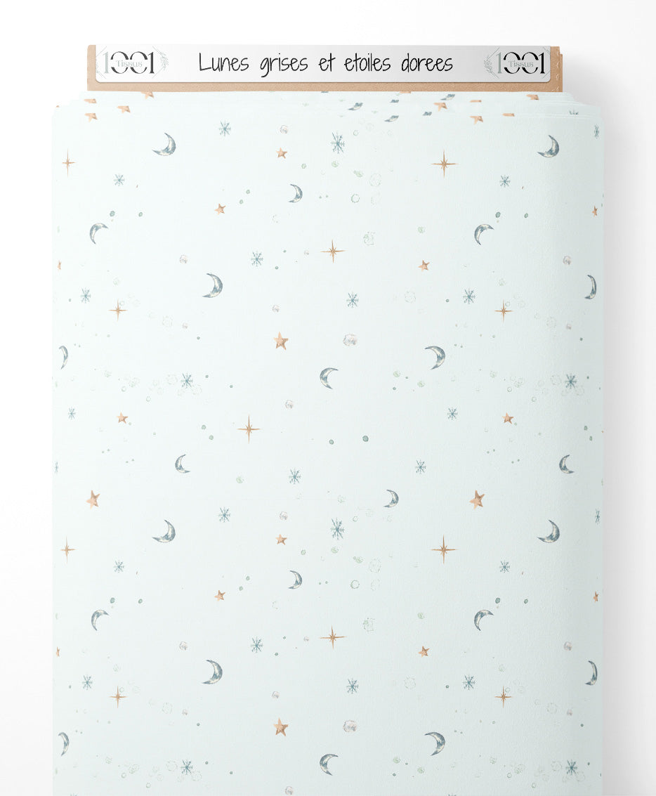 Les lunes sont de couleur grise et les étoiles sont dorées. De petits points et flocons ajoutent des détails subtils au motif. Le fond blanc met en valeur les éléments célestes.Les tissus