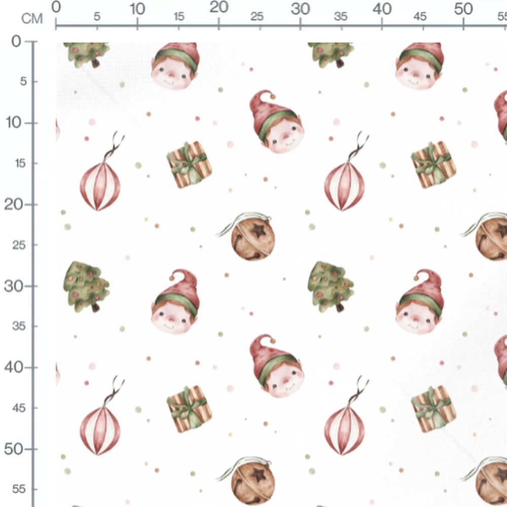 Les lutins portent des chapeaux rouges et sourient. Les sapins sont décorés de petites boules rouges. Les cadeaux sont ornés de rubans verts.Les tissus