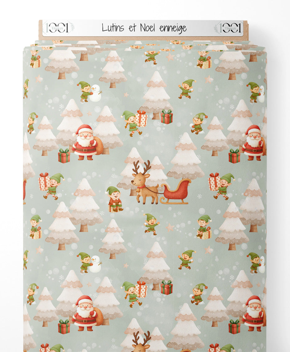 Un bonhomme de neige souriant accompagne les lutins. Le traîneau rouge est prêt pour la distribution des cadeaux. Des étoiles et flocons ajoutent une touche festive au décor.Les tissus