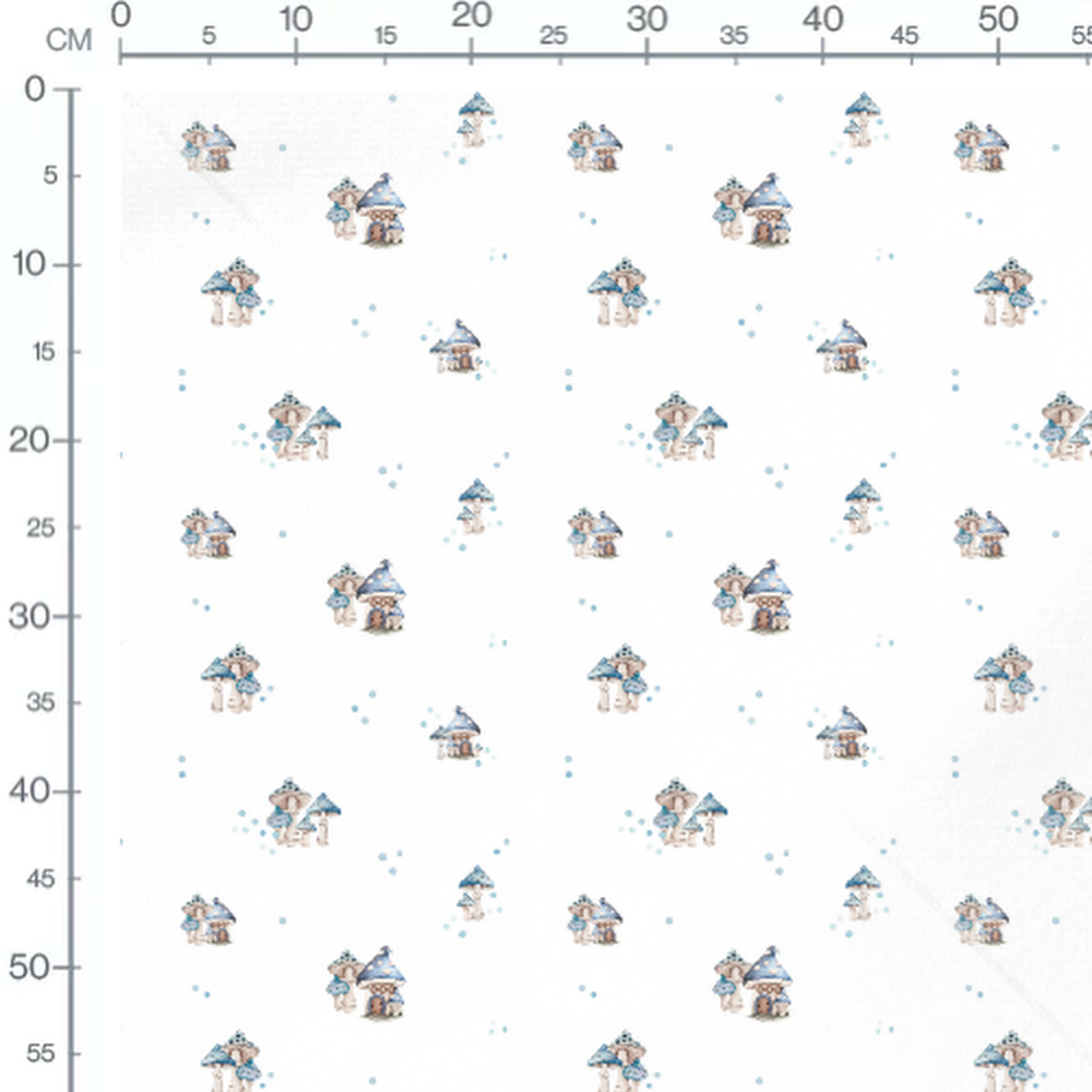 Les champignons ont des chapeaux bleus à pois blancs. La maison champignon est ornée de petites fenêtres et d'une porte en bois.Les tissus
