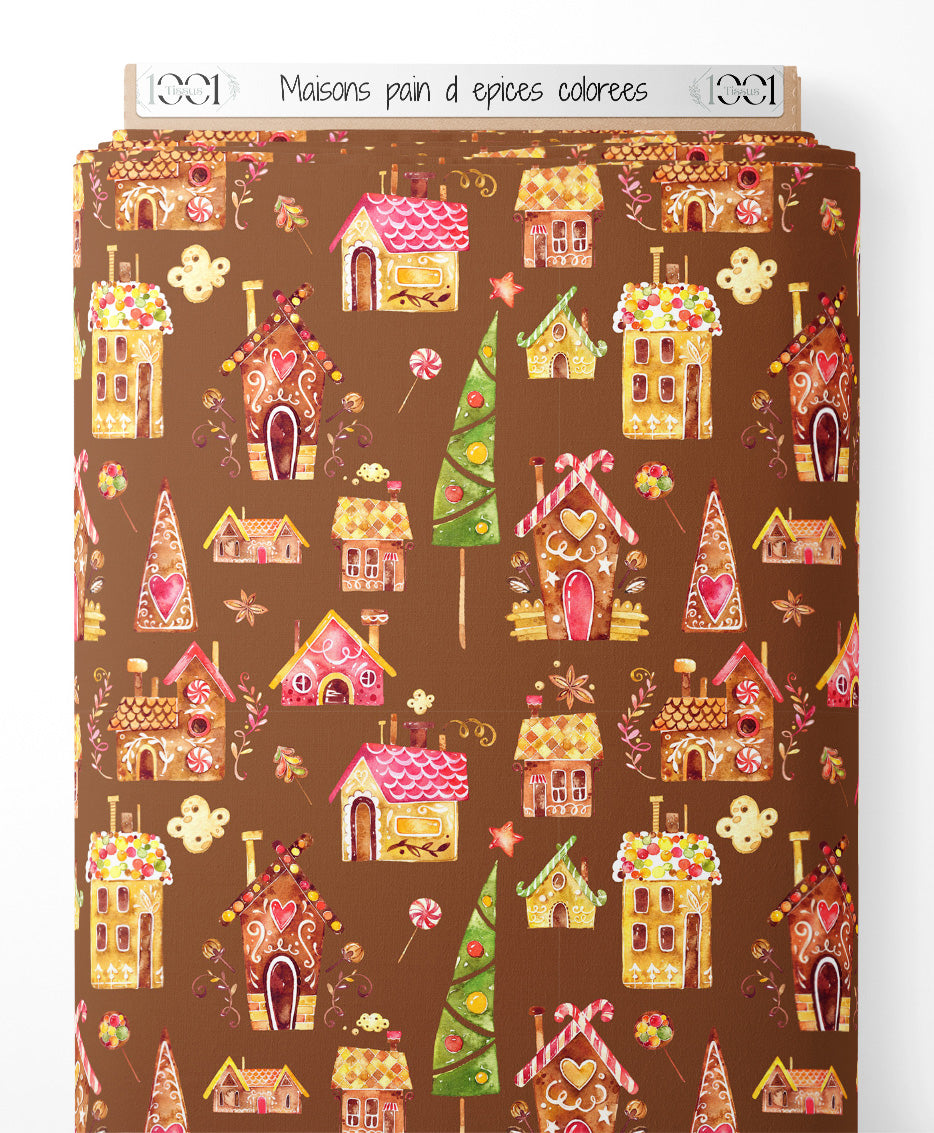 Les maisons sont ornées de motifs de sucre et de glaçage. Des arbres de Noël verts avec des décorations rouges et jaunes sont présents. Des bonbons en forme de sucettes et des étoiles complètent le motif.Les tissus