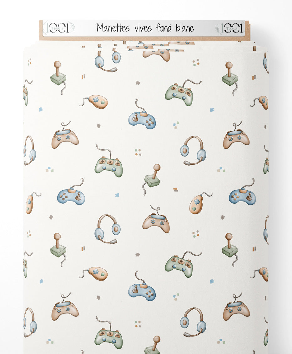 Les manettes sont de différentes formes et couleurs, incluant du beige, du bleu et du vert. Les casques sont assortis avec des nuances de beige et de bleu. Les joysticks et les souris complètent le motif avec des tons pastel. De petits carrés colorés ajoutent des touches de couleur supplémentaires.Les tissus