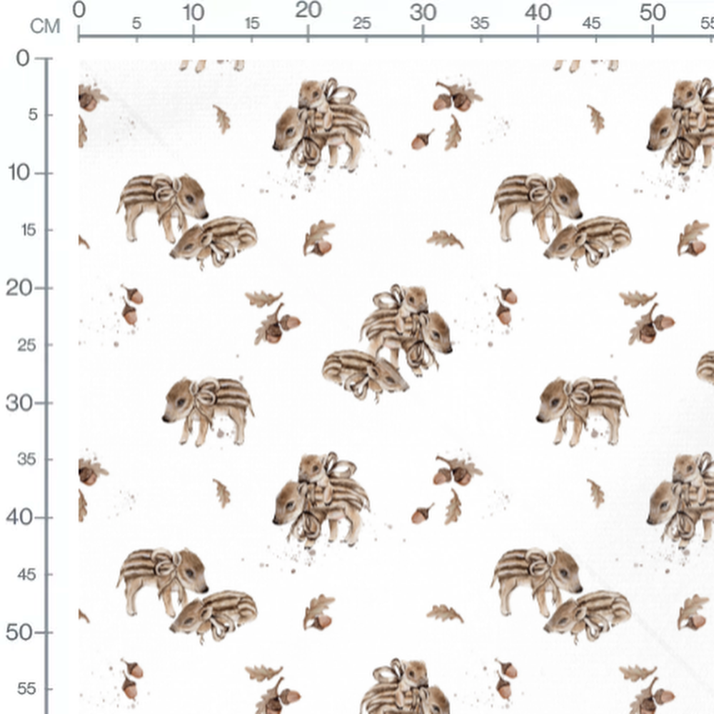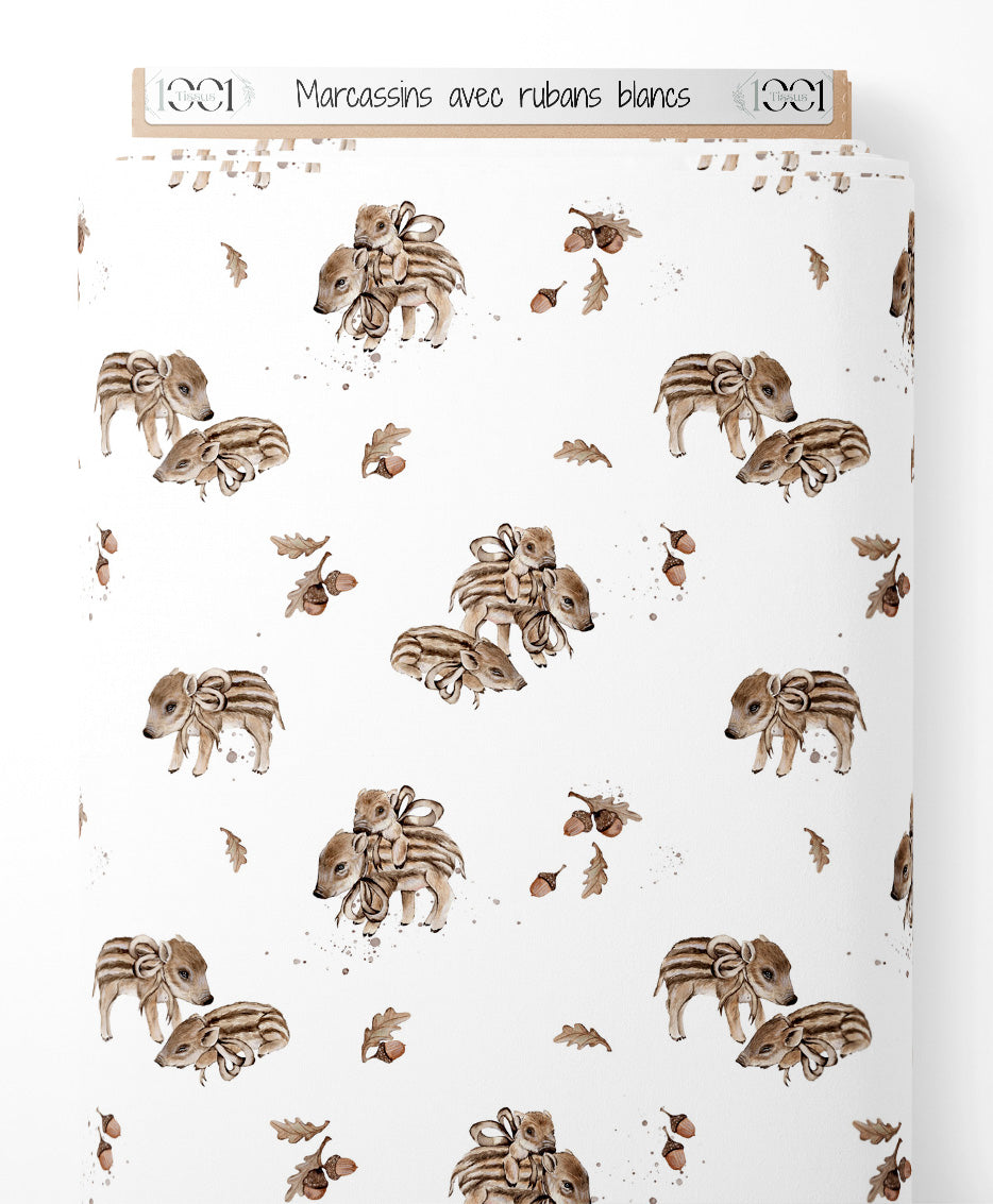 Les marcassins sont ornés de rubans délicats. Les glands et les feuilles ajoutent une touche naturelle au motif.Les tissus