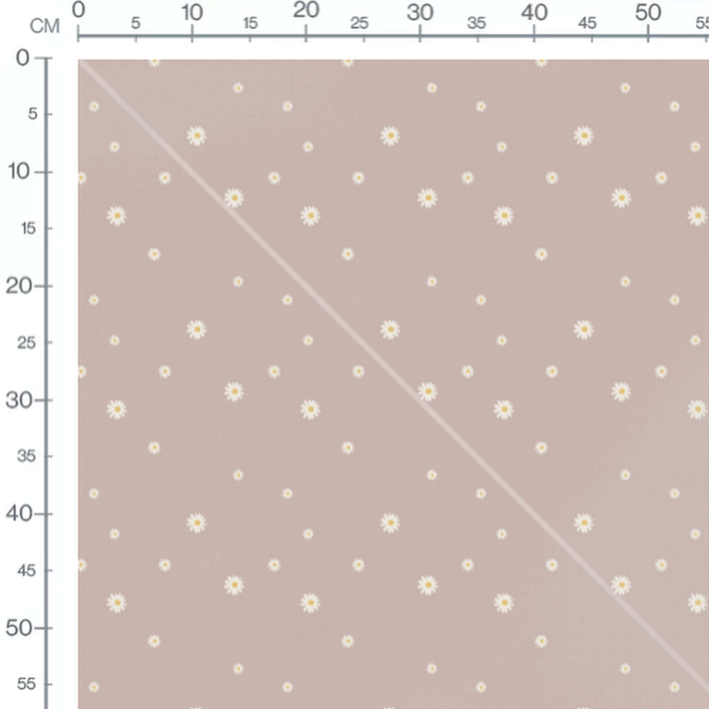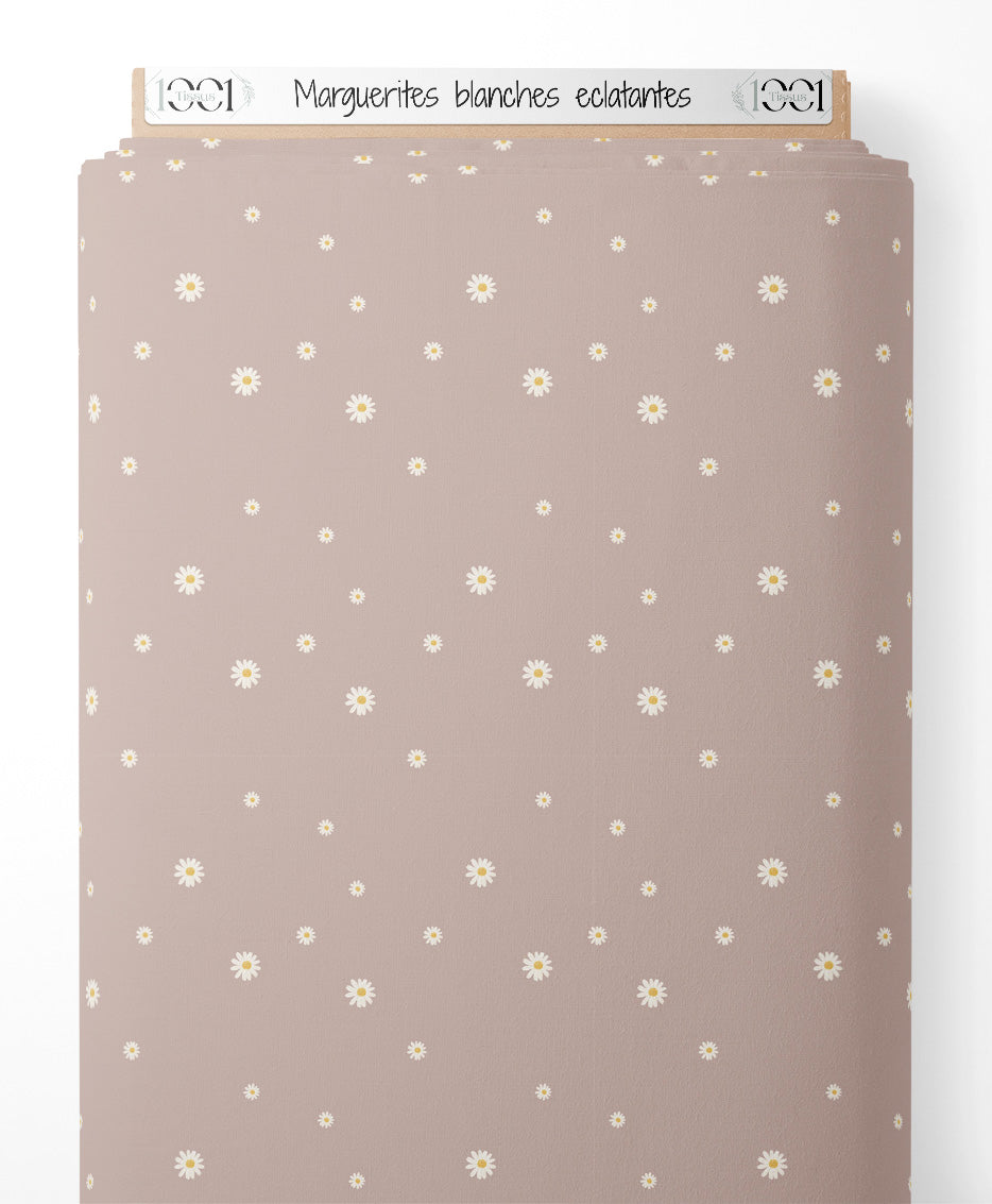 Les marguerites sont dispersées uniformément sur le fond. Le contraste entre le blanc des pétales et le beige du fond crée un effet doux. Les cœurs jaunes ajoutent une touche de couleur vive.Les tissus