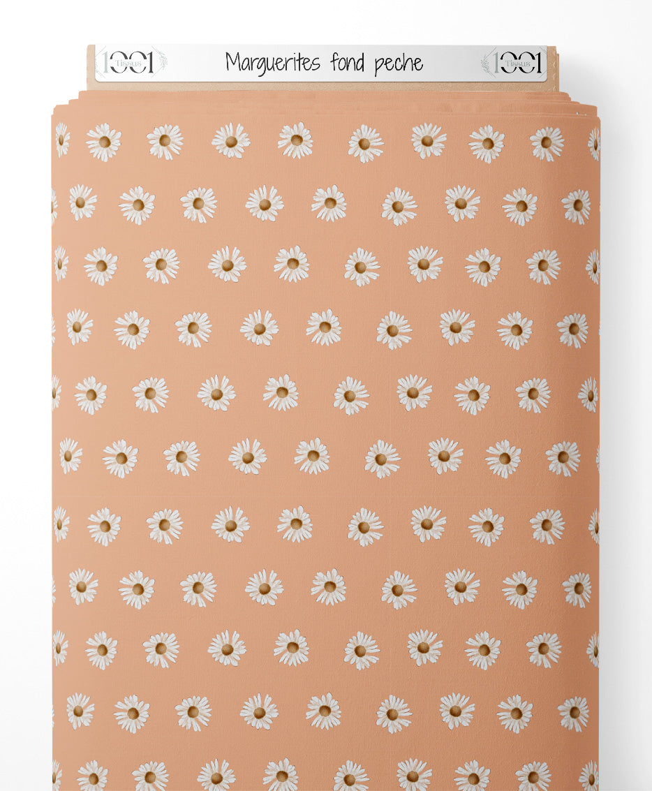 Les marguerites sont disposées de manière régulière sur le fond pêche. Chaque fleur est blanche avec un centre jaune distinctif. Le fond pêche met en valeur la simplicité des marguerites.Les tissus