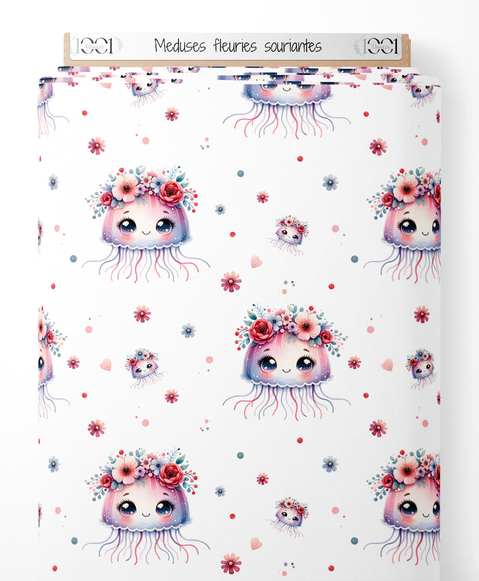 Les méduses ont des visages souriants et portent des couronnes de fleurs colorées. Les fleurs autour sont de différentes tailles et teintes, principalement roses et bleues. De petits cœurs et points colorés complètent le motif.Les tissus