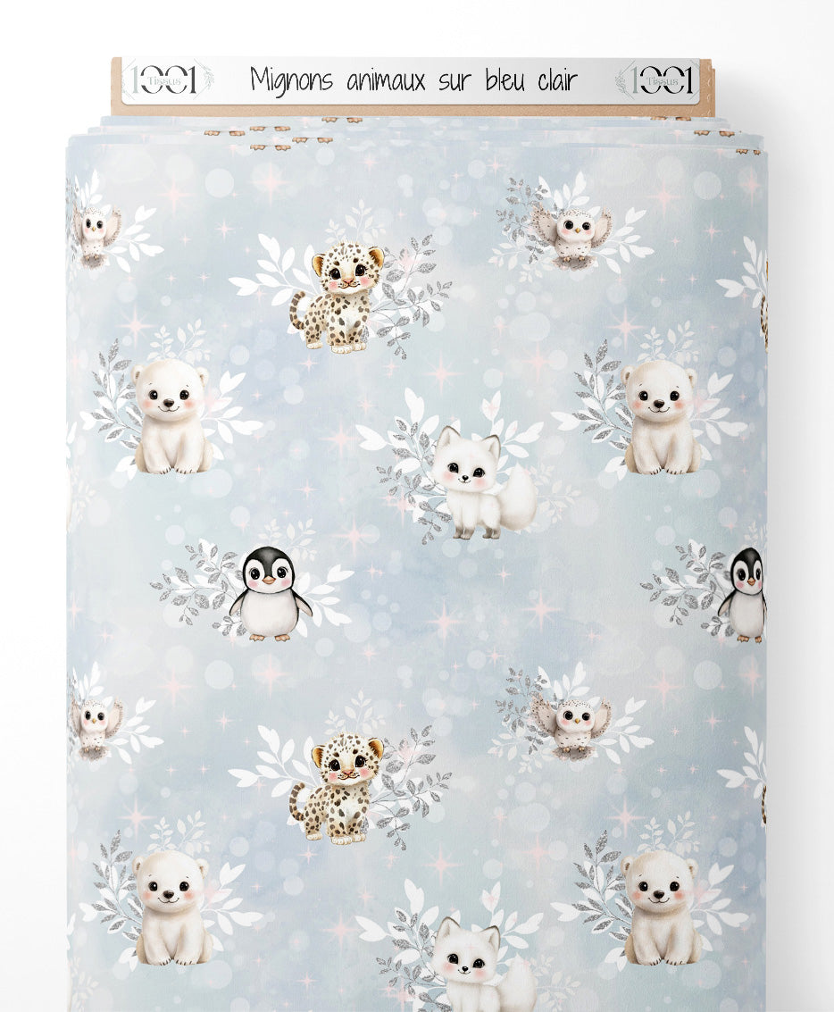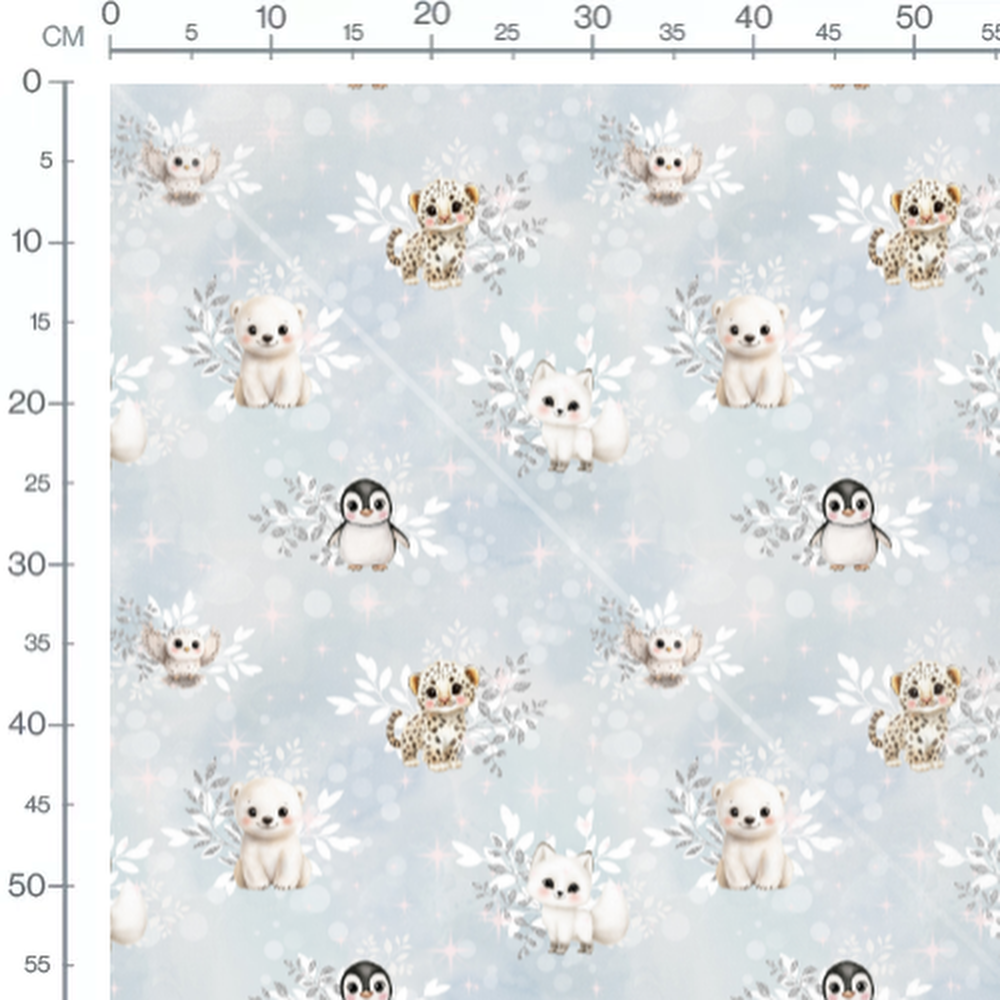 Un bébé léopard des neiges, un hibou, un ours polaire, un pingouin et un renard arctique sont présents. Le fond est parsemé de motifs de feuilles et de légères étoiles scintillantes.Les tissus