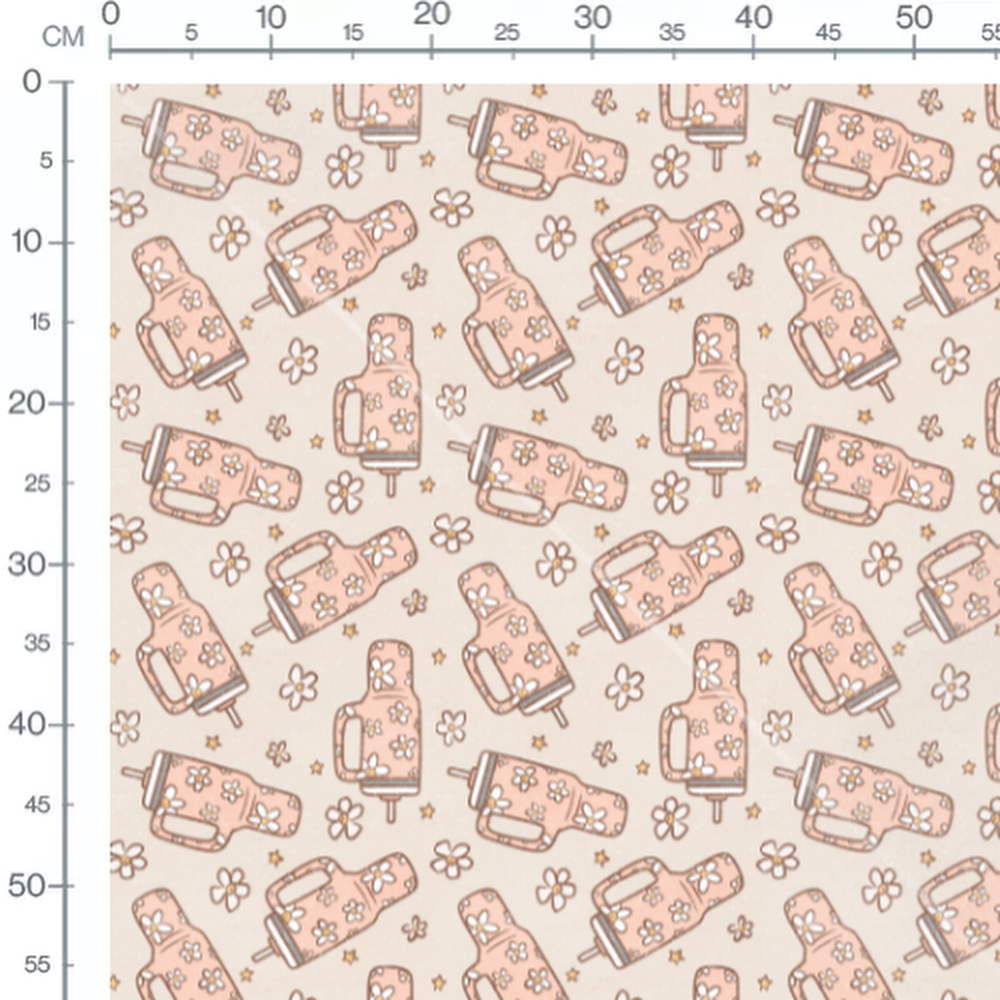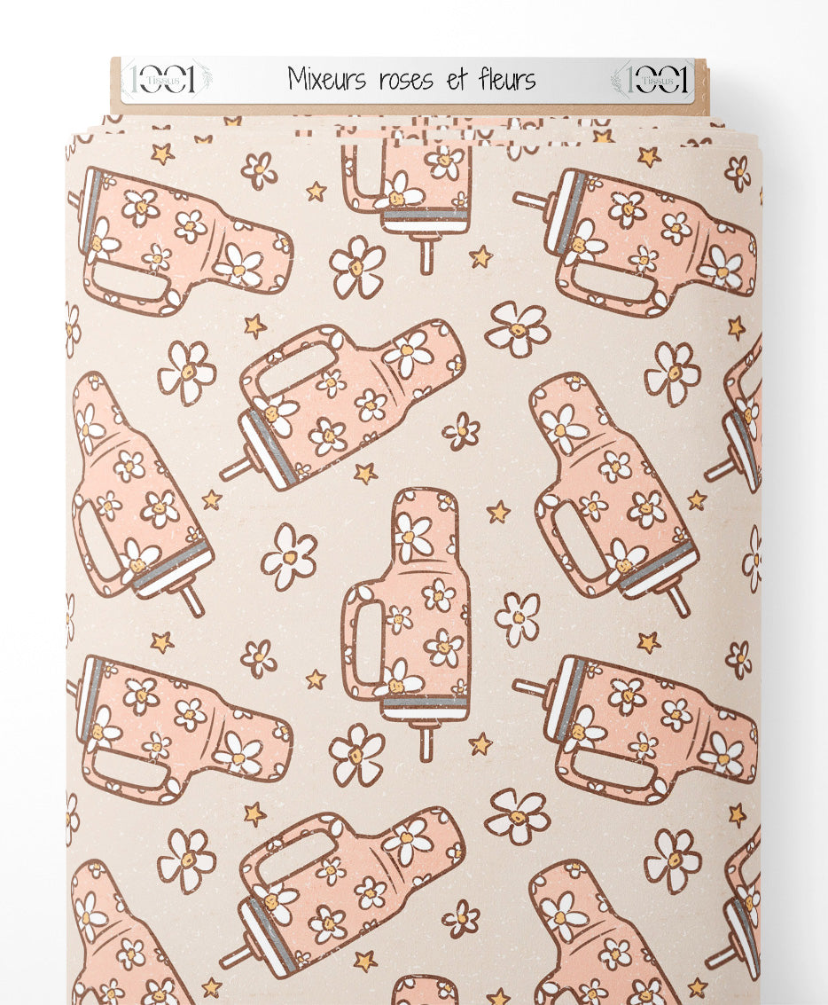 Les mixeurs sont décorés de petites fleurs blanches avec des centres jaunes. Des étoiles dorées ajoutent une touche de contraste au fond beige.Les tissus