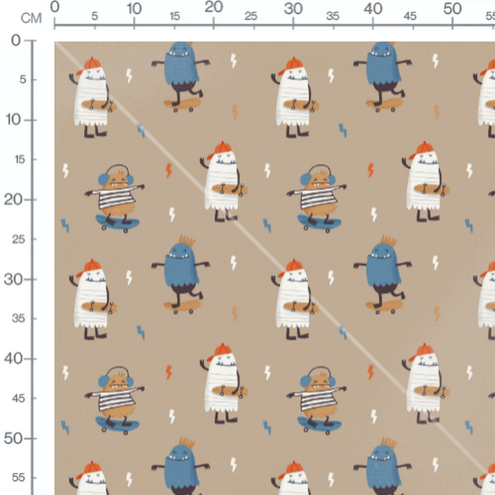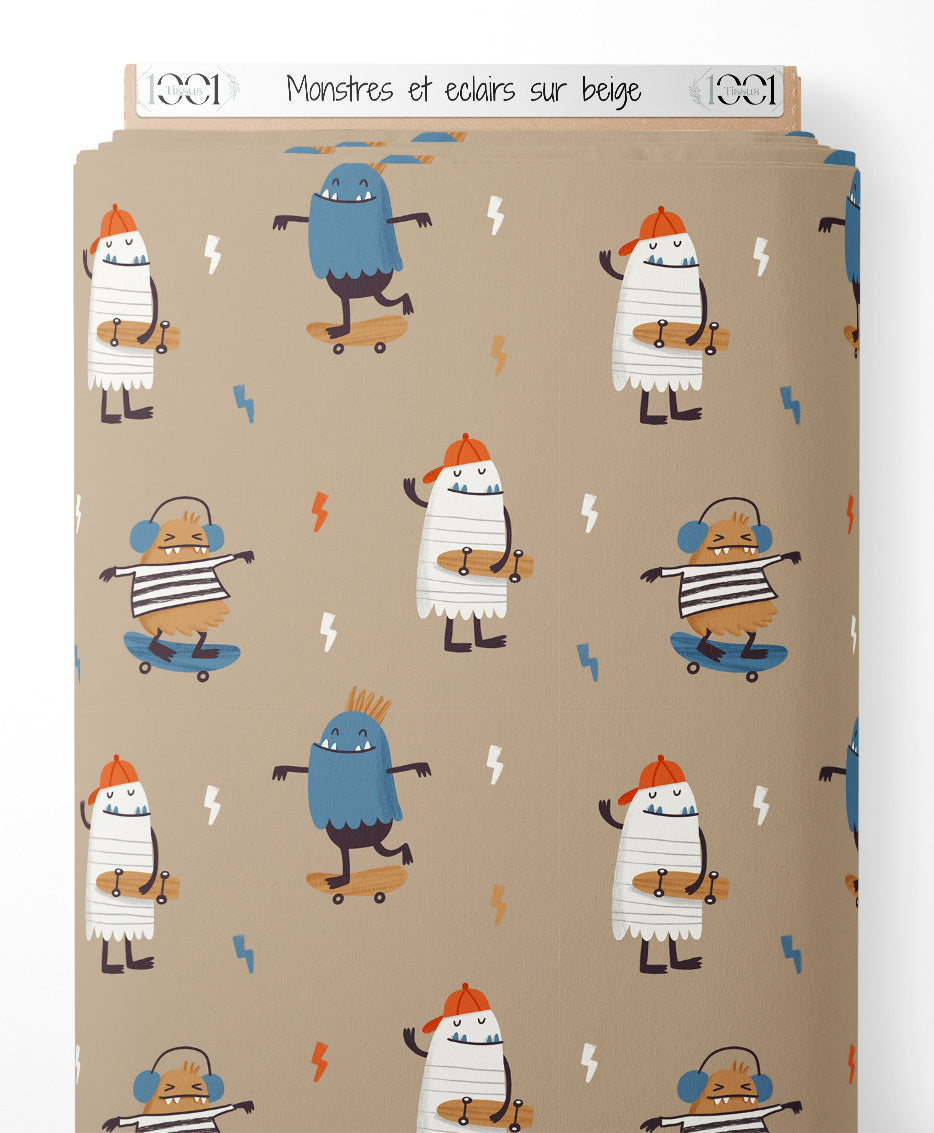 Les monstres portent des casquettes et des écouteurs. Ils sont de différentes couleurs, comme bleu et marron. Les éclairs ajoutent une touche dynamique au motif.Les tissus