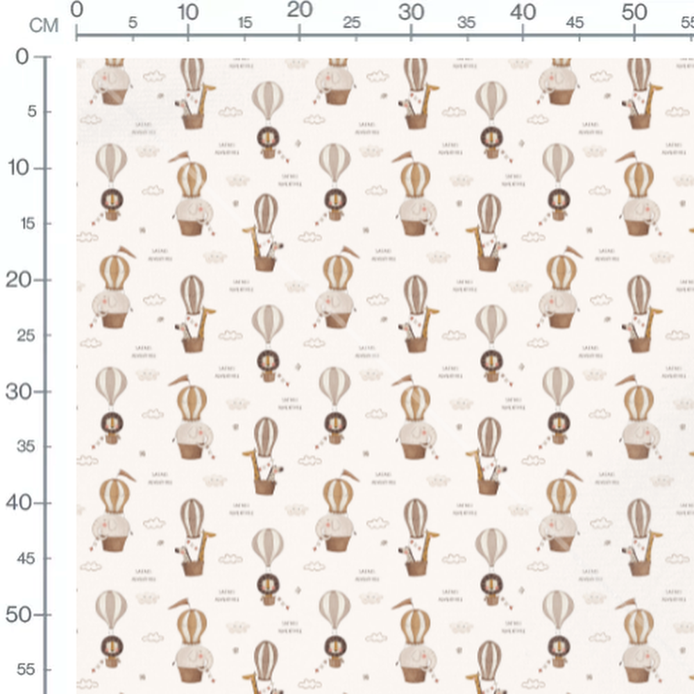 Les animaux incluent un éléphant, une girafe et un lion. Les montgolfières sont en beige et marron. De petits nuages blancs parsèment le fond.Les tissus