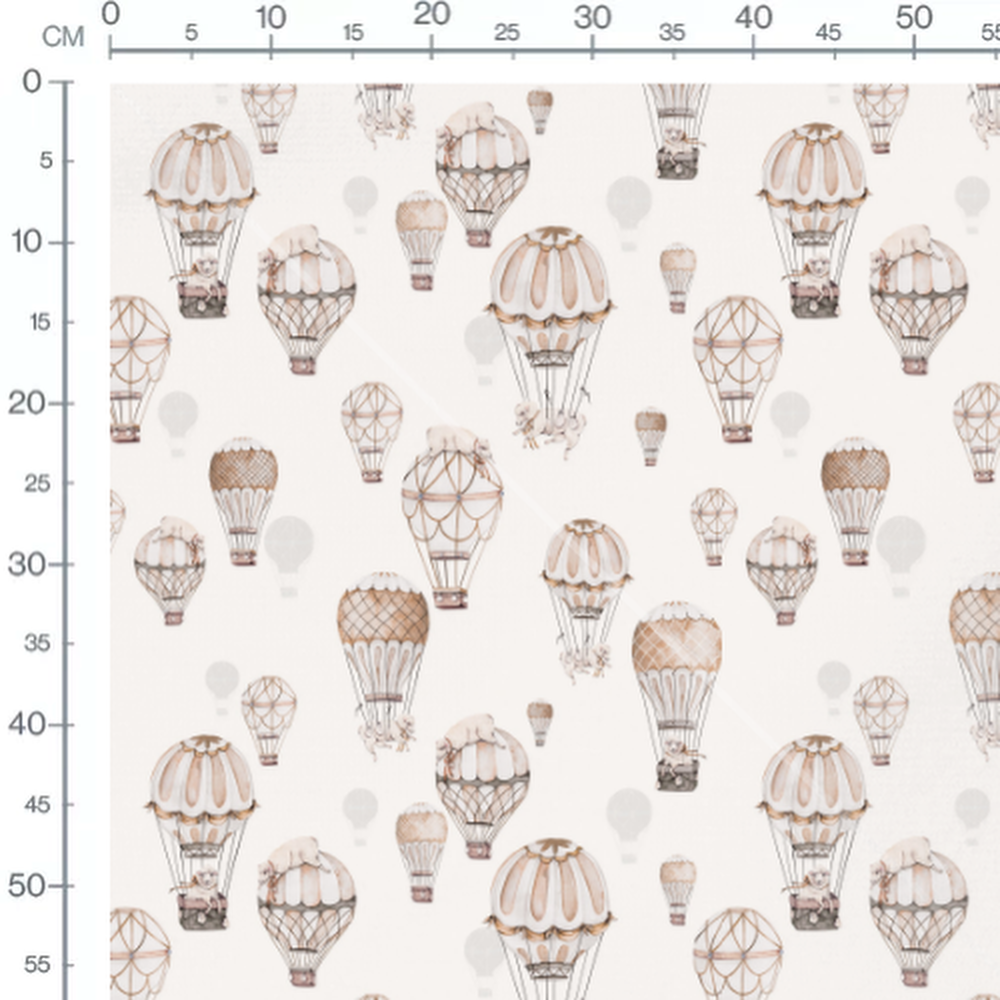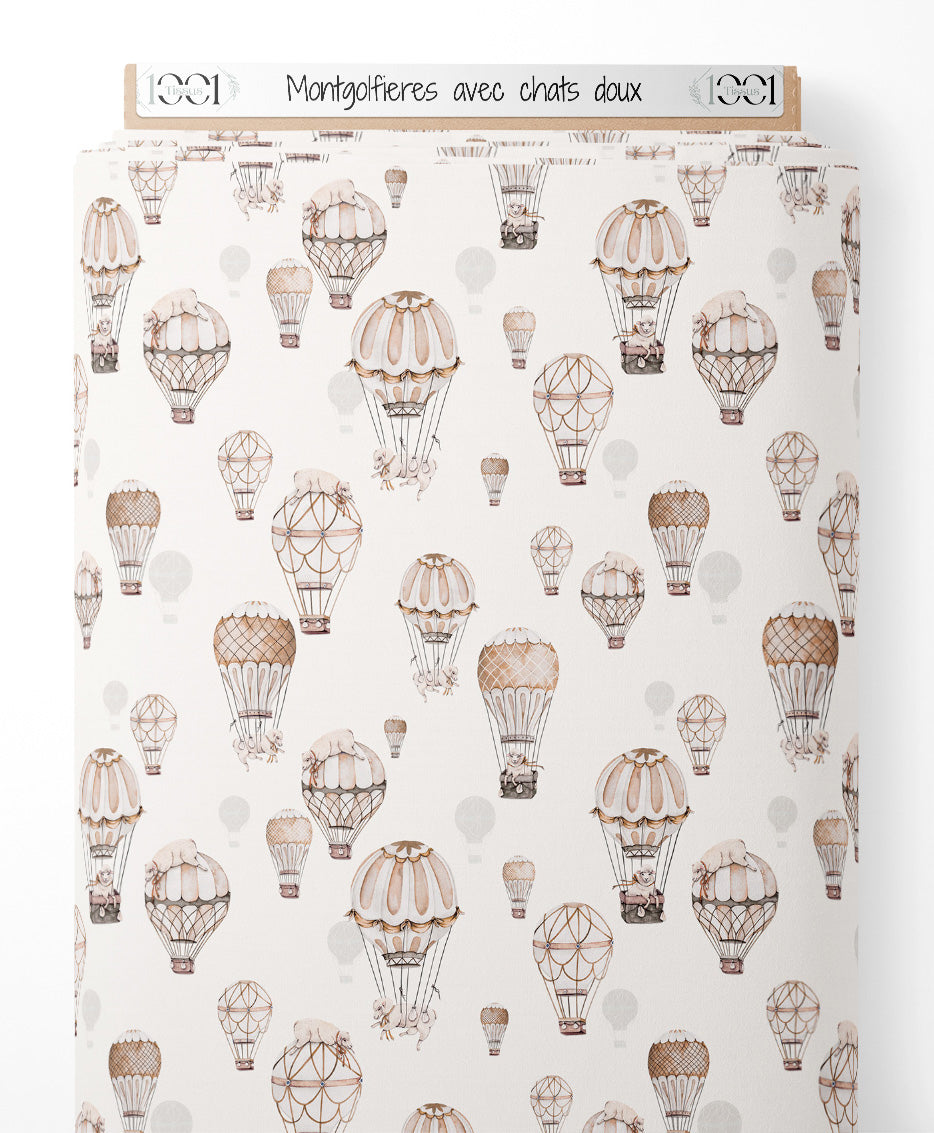 Les montgolfières sont décorées de motifs géométriques. Les animaux sont assis ou couchés dans les nacelles. Le fond blanc met en valeur les couleurs douces des montgolfières.Les tissus