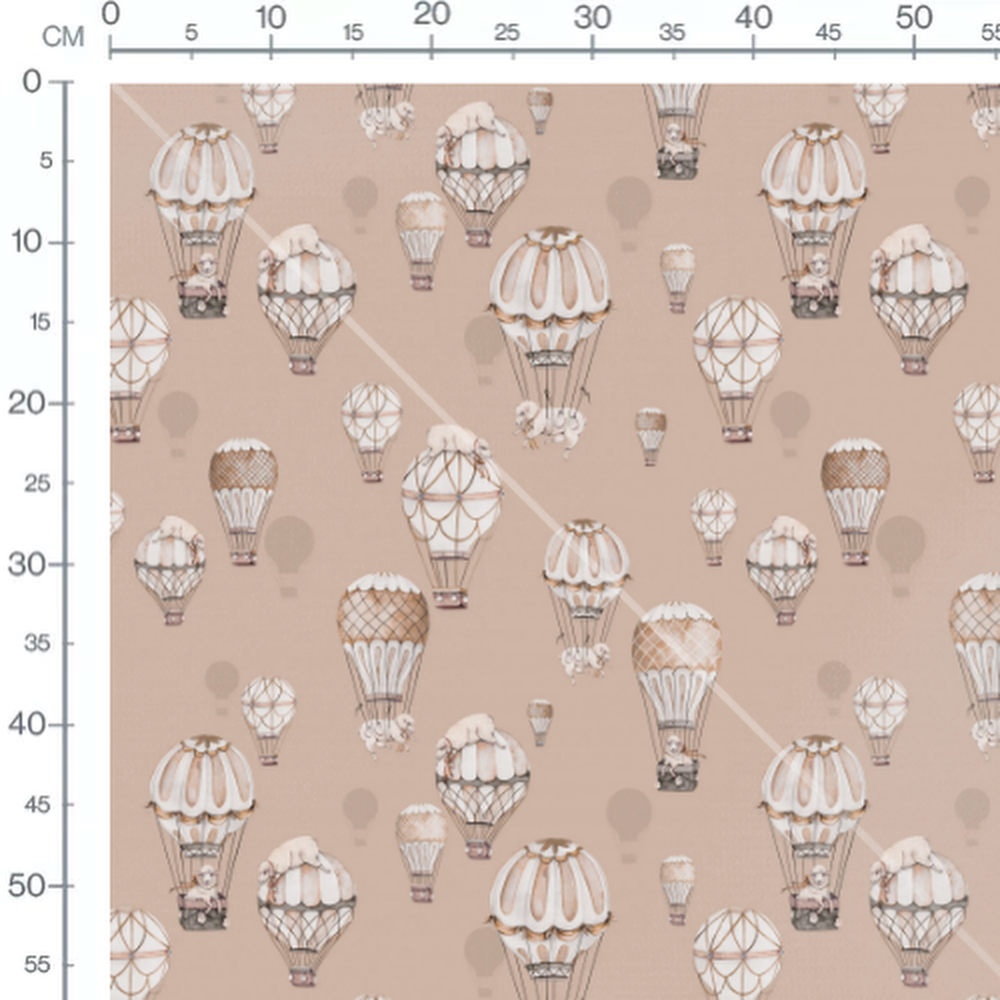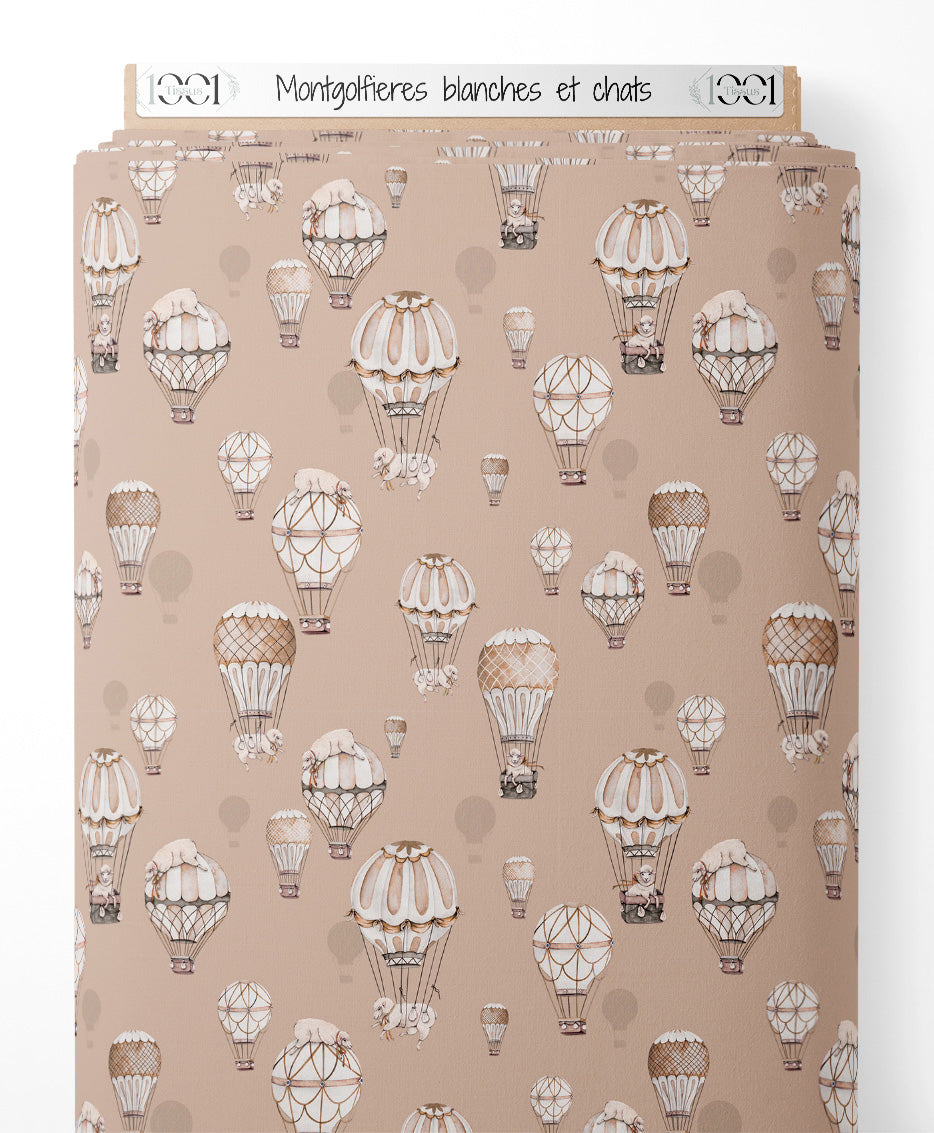 Les montgolfières sont décorées de motifs géométriques subtils. Les animaux semblent paisibles et confortablement installés. Le fond beige met en valeur les détails des montgolfières et des animaux.Les tissus