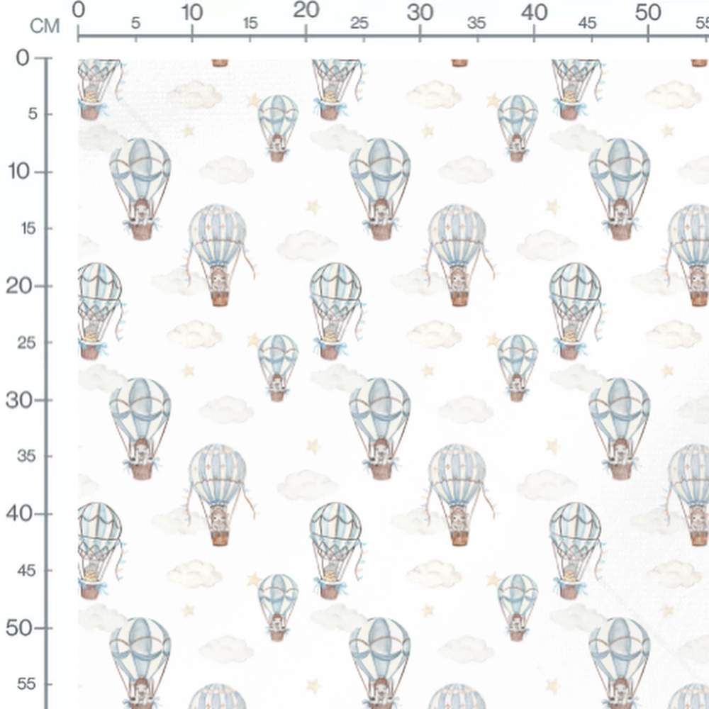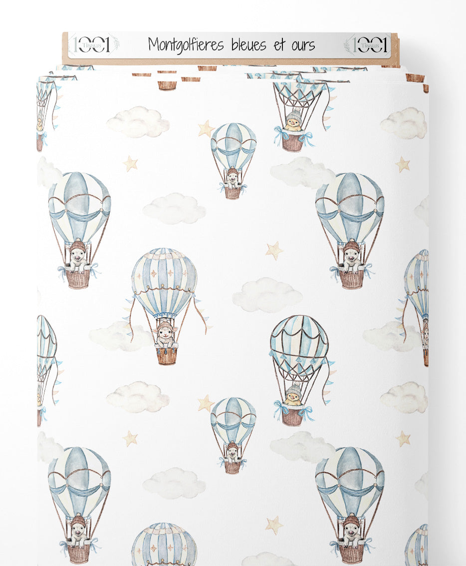 Les montgolfières sont décorées de motifs bleus et marron. Les animaux, tels que des ours et des chiens, sont assis dans les paniers. De petits nuages blancs et des étoiles beige parsèment le fond.Les tissus