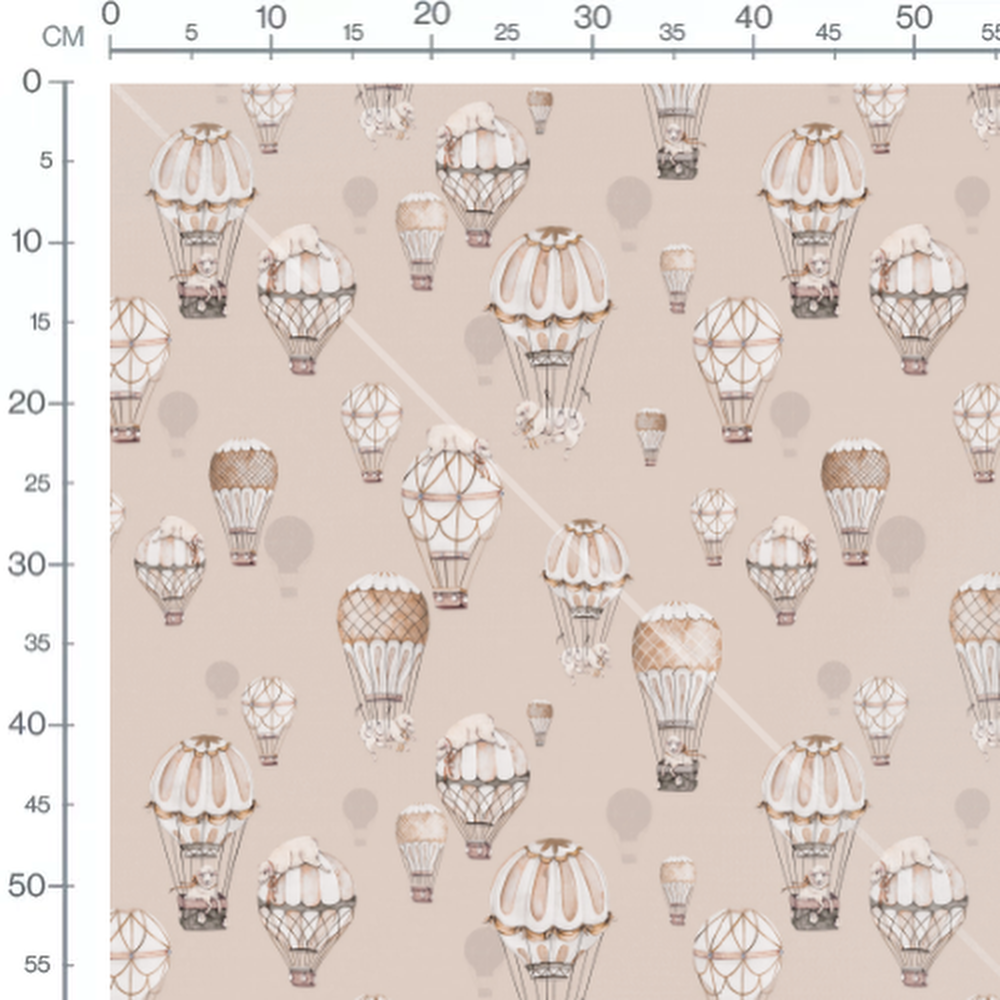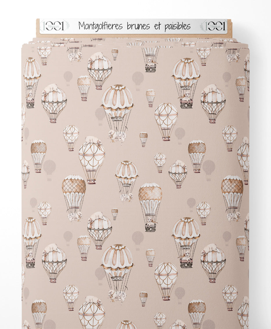 Les montgolfières sont décorées de motifs géométriques subtils. Les animaux semblent paisibles et ajoutent une touche ludique au motif. Le fond beige met en valeur les couleurs douces des montgolfières et des animaux.Les tissus