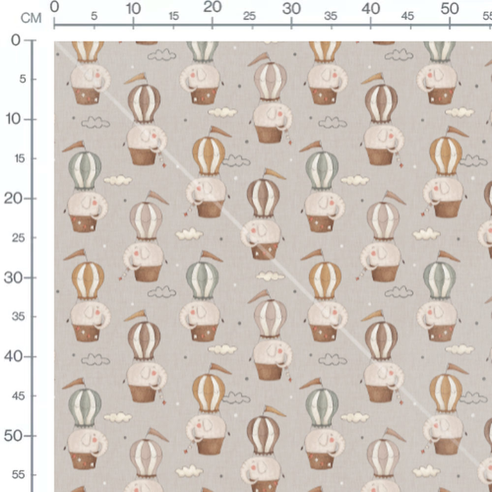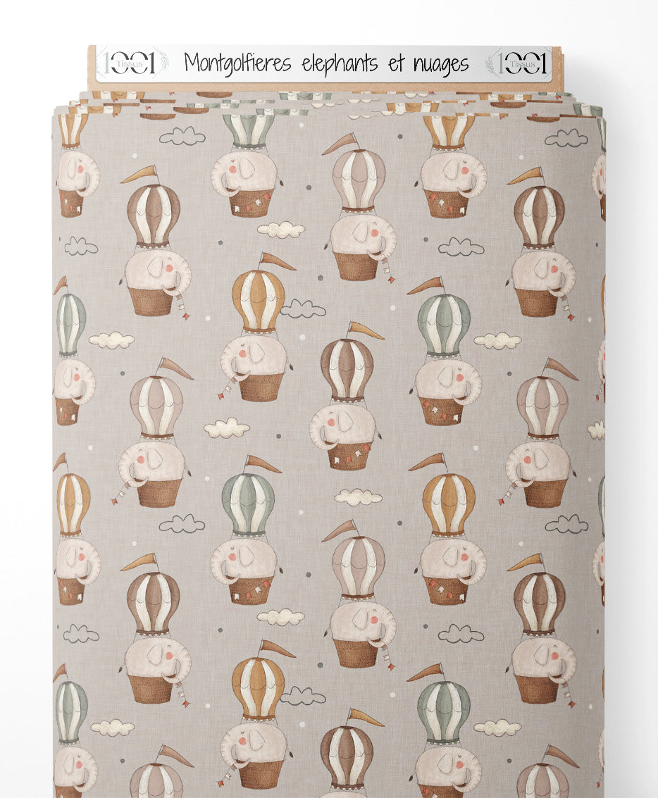 Les éléphants sont assis dans des montgolfières aux rayures marron et beige. De petits nuages blancs flottent entre les montgolfières. Des points gris parsèment le fond gris clair.Les tissus