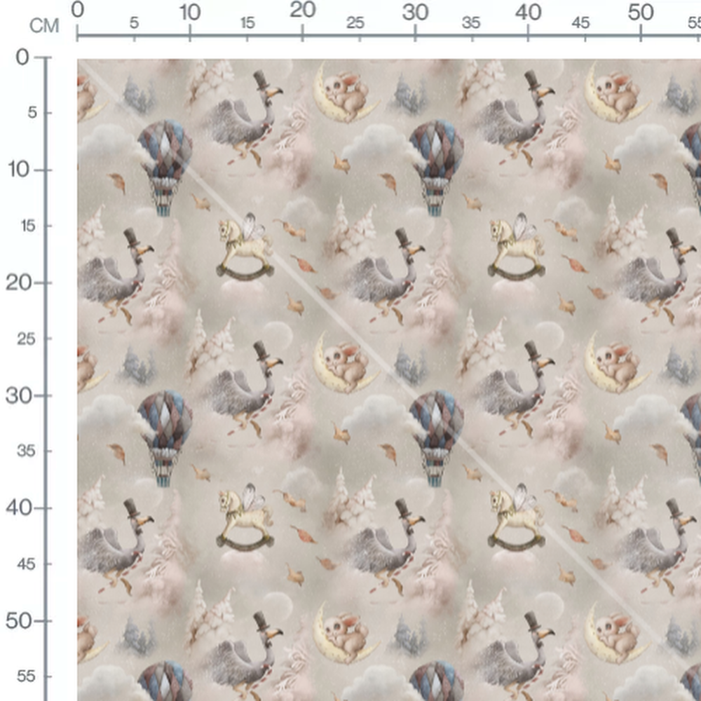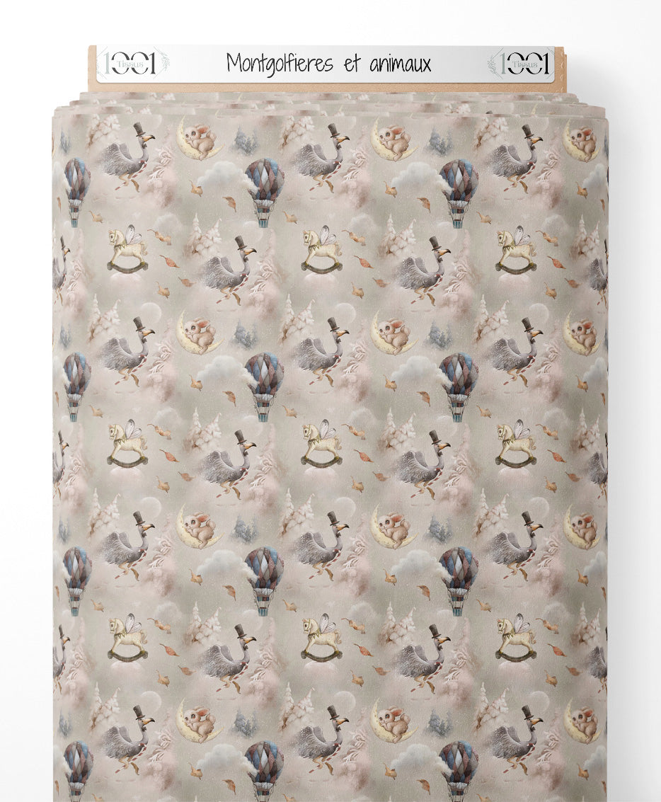 Un koala sur la lune et des oiseaux en chapeaux ajoutent une touche de fantaisie. Des chevaux à bascule et des feuilles flottantes complètent le motif. Les couleurs douces créent une ambiance onirique et apaisante.Les tissus