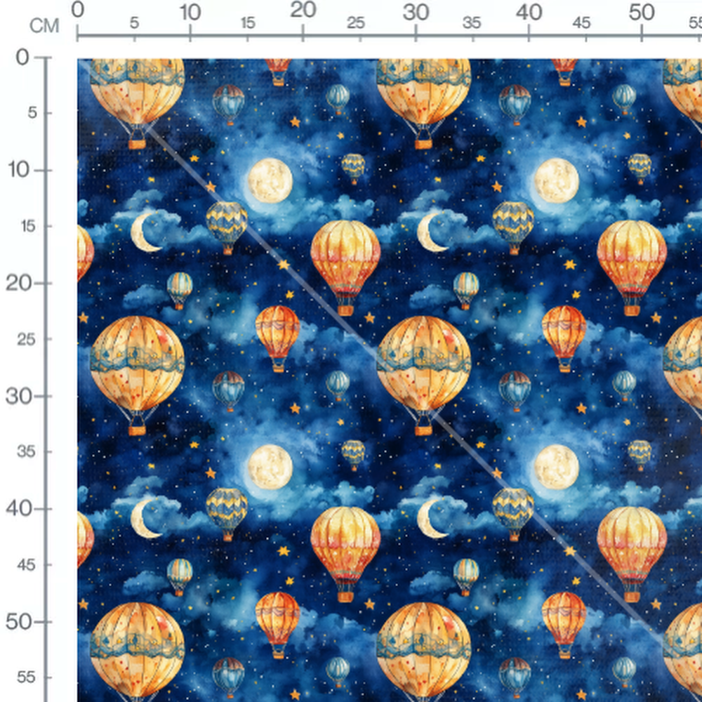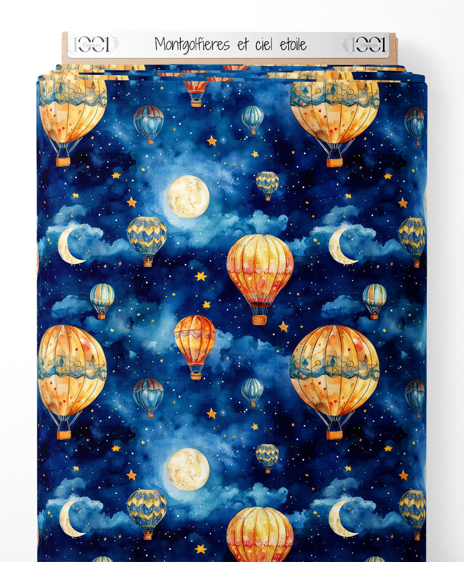 Les montgolfières sont ornées de motifs variés et de couleurs chaudes. La lune et les étoiles ajoutent une touche lumineuse au ciel sombre. Les nuages apportent une texture douce à l'ensemble.Les tissus