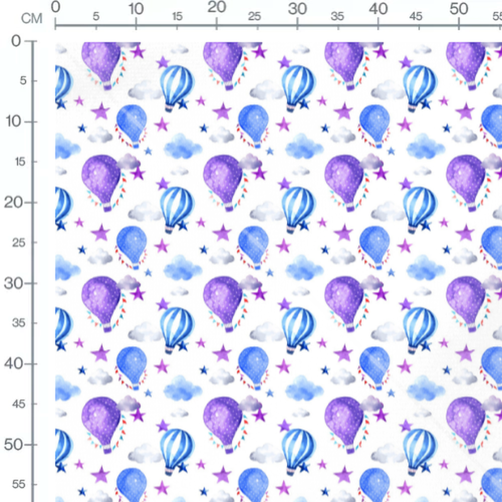 Les montgolfières sont décorées de motifs à pois et de rayures. De petites guirlandes colorées ornent certaines montgolfières. Les étoiles sont de différentes tailles et nuances de violet.Les tissus