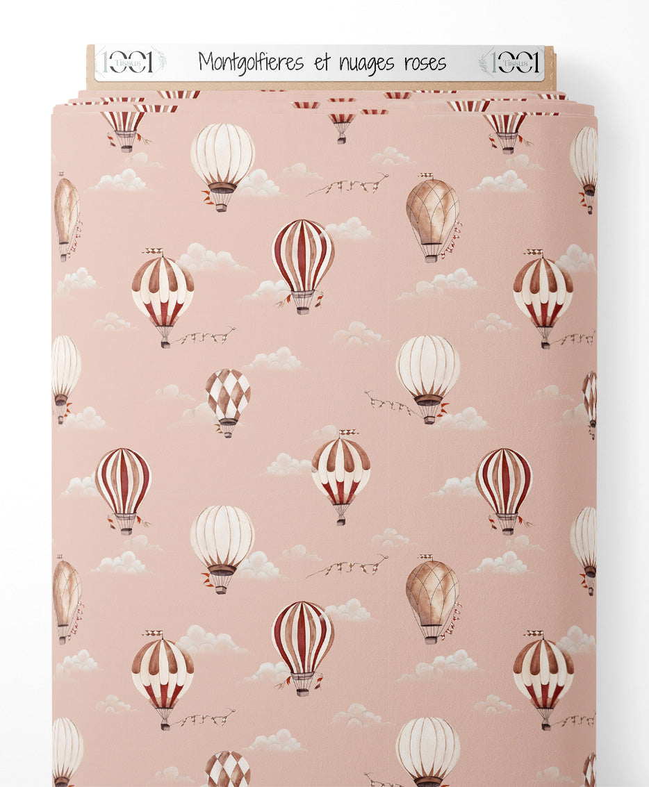 Les montgolfières sont de différentes tailles et motifs, certaines rayées, d'autres unies. Le fond rose pastel est parsemé de petits nuages blancs. Quelques montgolfières ont des motifs géométriques subtils.Les tissus