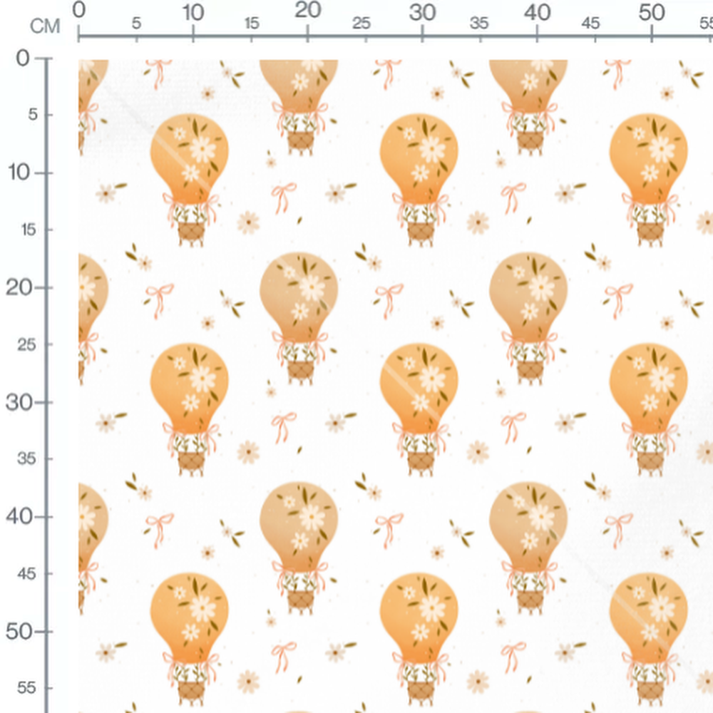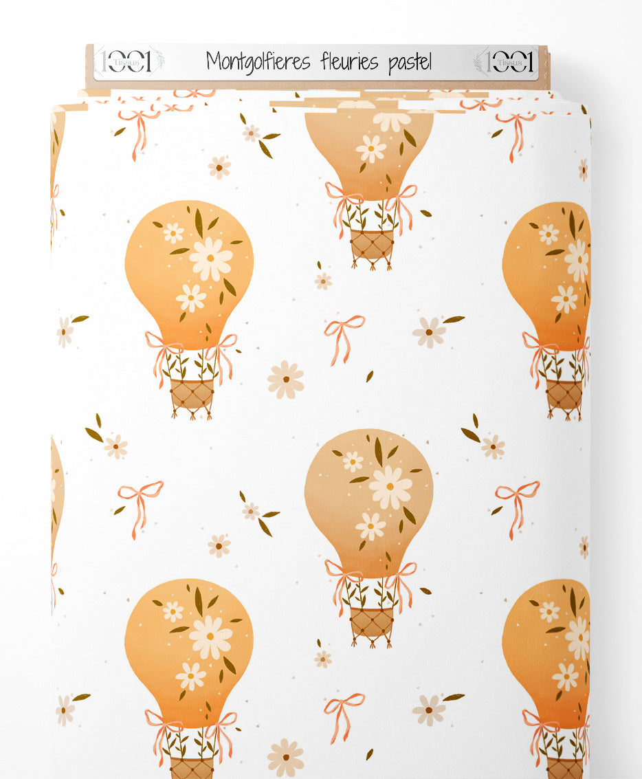 Les montgolfières sont ornées de grandes fleurs blanches et de petites feuilles vertes. Des rubans roses ajoutent une touche délicate. De petites fleurs et feuilles sont dispersées autour des montgolfières.Les tissus