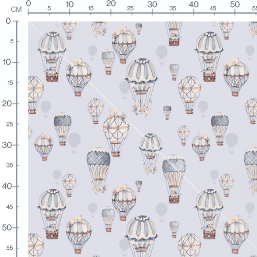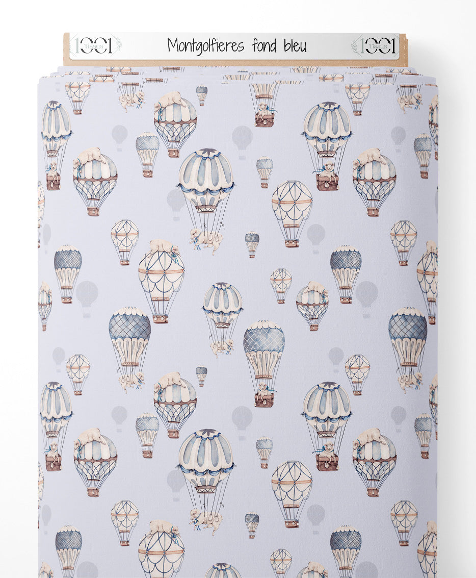 Les montgolfières sont décorées de motifs bleus et blancs. Les animaux sont assis ou couchés dans les nacelles. Le fond est d'un bleu clair uniforme.Les tissus